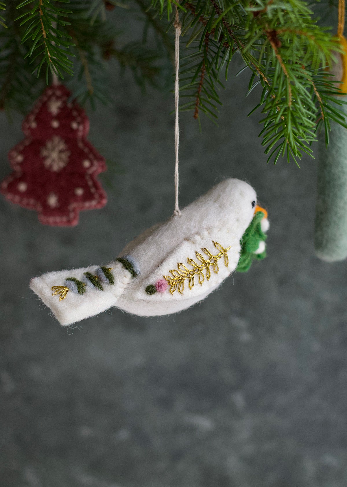 Delicately handcrafted felt ornament in the shape of a white dove, symbolizing peace and harmony. A timeless piece for Christmas trees or seasonal displays, easy to combine with other felt decorations.
