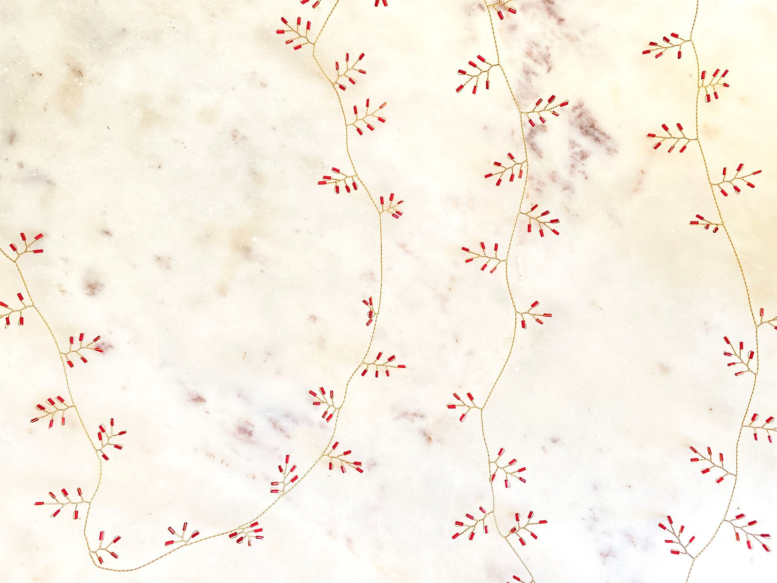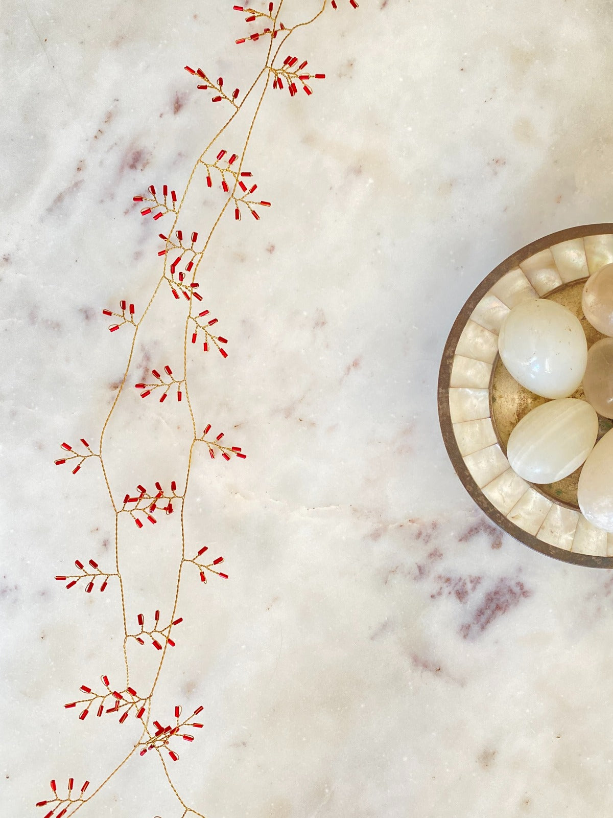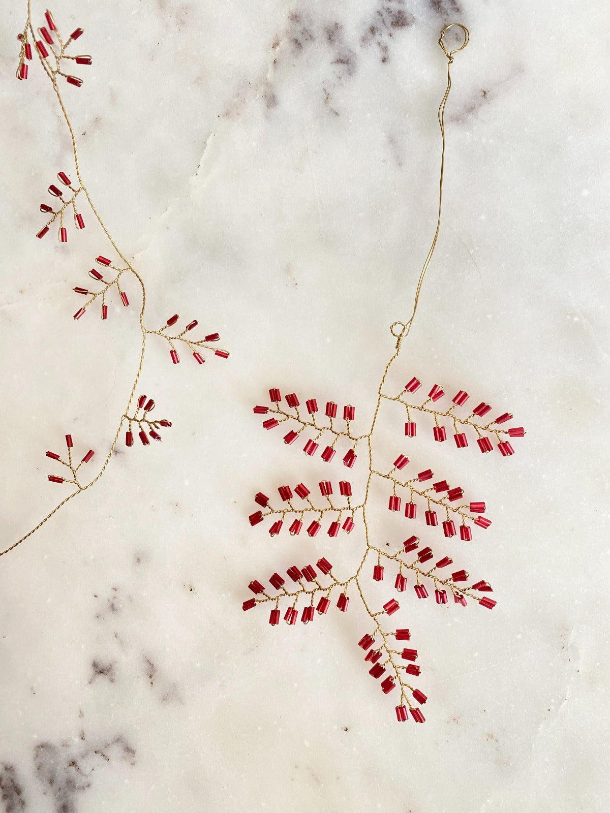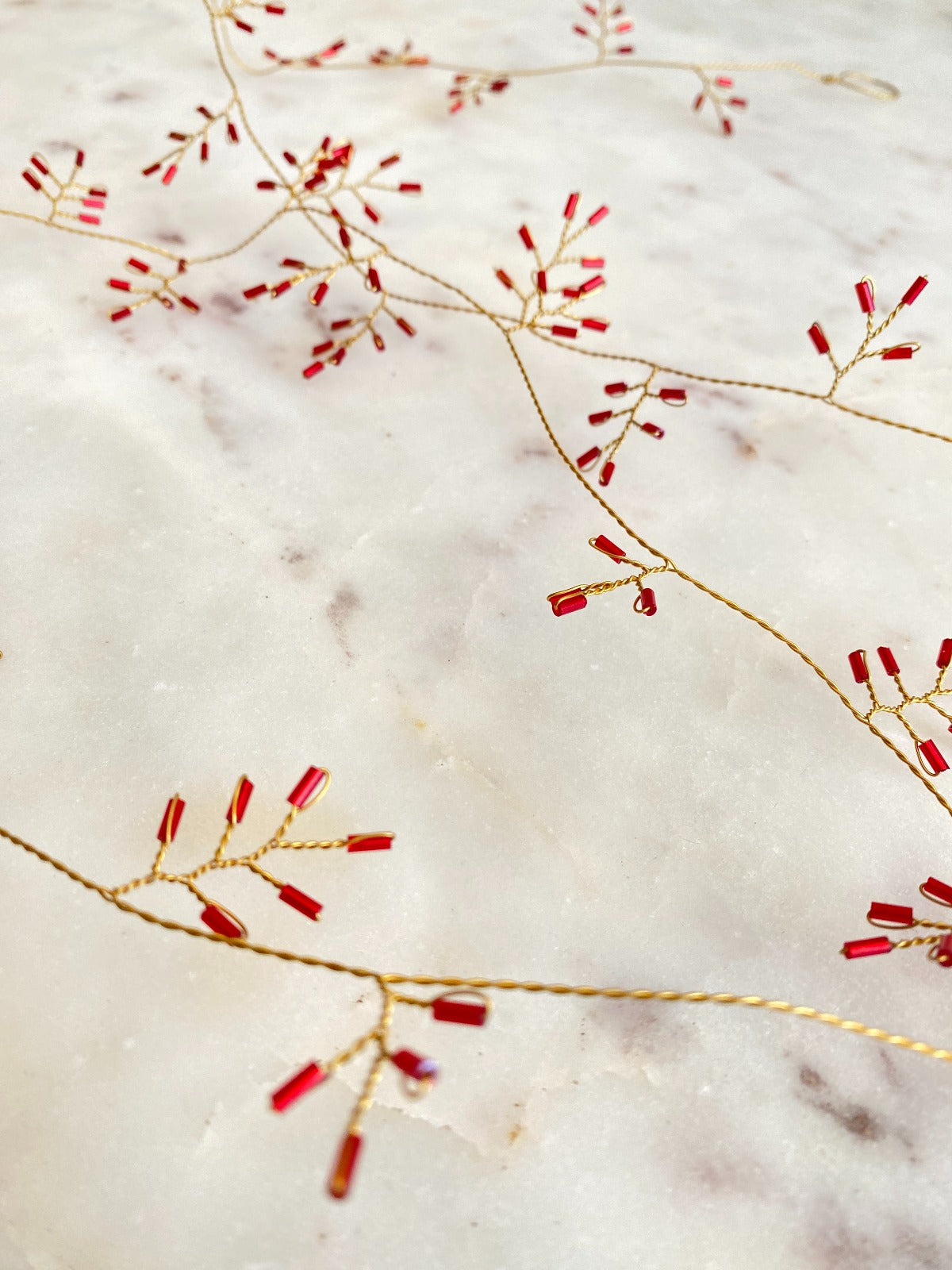 Belle guirlande faite main en laiton doré avec perles rouges.