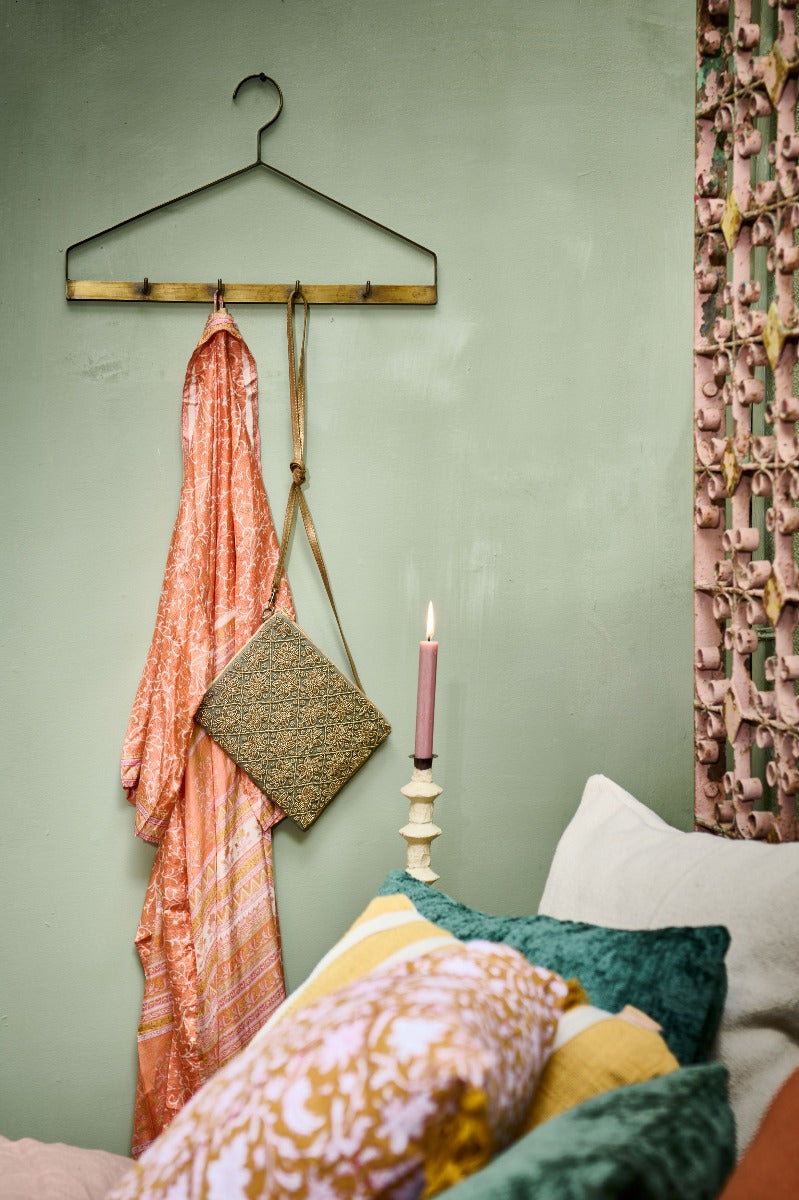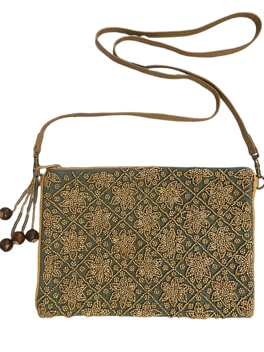 Fashionable linnen pouch handmade with golden beads and long handle.
