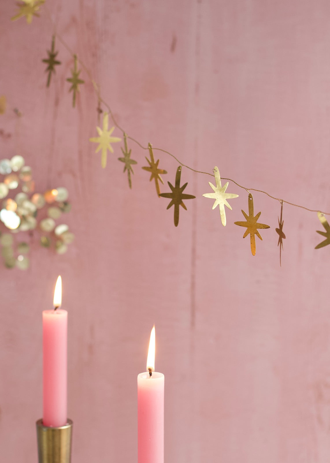 Northern Star Garland TI1124, a charming decoration crafted from handcut brass. Each star is carefully shaped to catch and reflect light. Perfect for holiday decorating or as a year-round accent piece that adds a touch of celestial magic to your home.