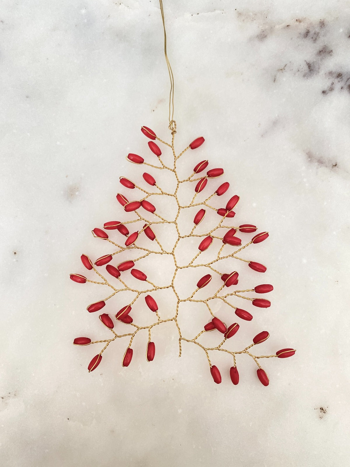 Suspension décorative en forme de petit sapin de Noël réalisée en perles rouges.