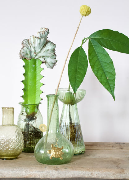 Ce vase en verre vert au design raffiné est fabriqué artisanalement à partir de matériaux recyclés et selon des techniques traditionnelles de soufflage à la bouche. Sa forme unique et sa production écologique en font un objet charmant et durable. Idéal pour mettre en valeur vos fleurs préférées ou comme pièce décorative à part entière.
