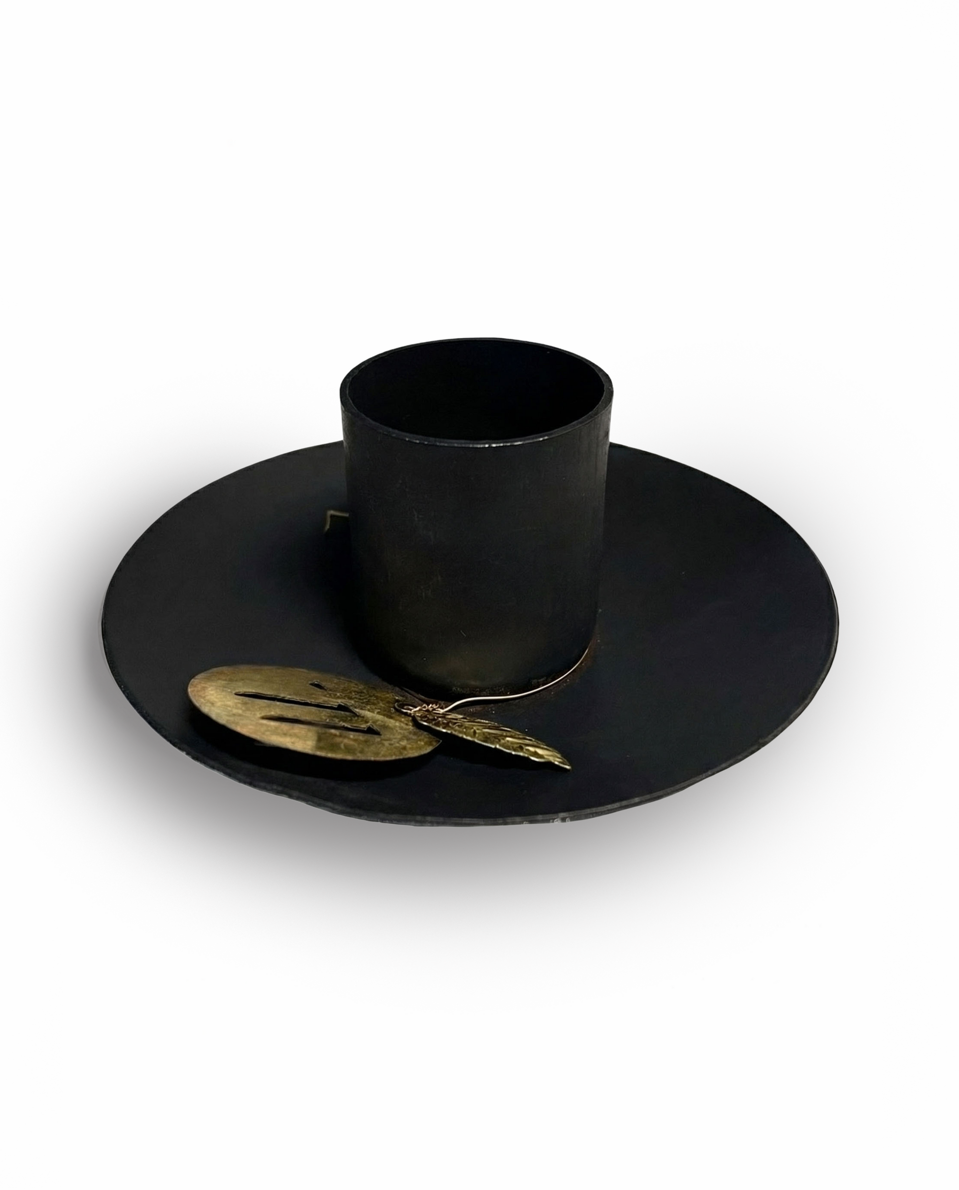 Handgemaakte kandelaar in de kleur zwart met een decoratief label. Kan alleen worden gebruikt voor korte kaarsen van 4/5 uur.