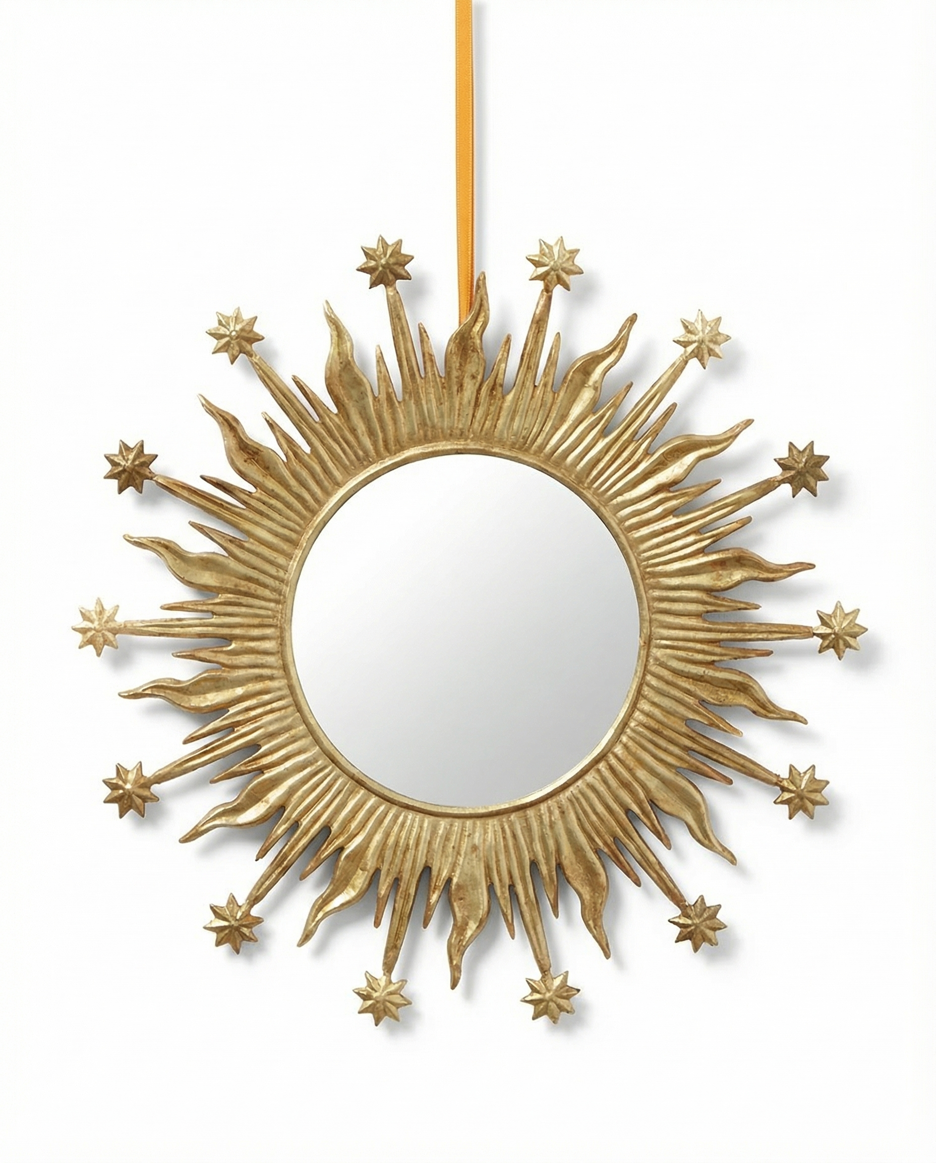 Handgemaakte gouden spiegel uit India. In de vorm van een zon met prachtige vallende sterren eromheen. Middelgroot, ook verkrijgbaar in small en large.