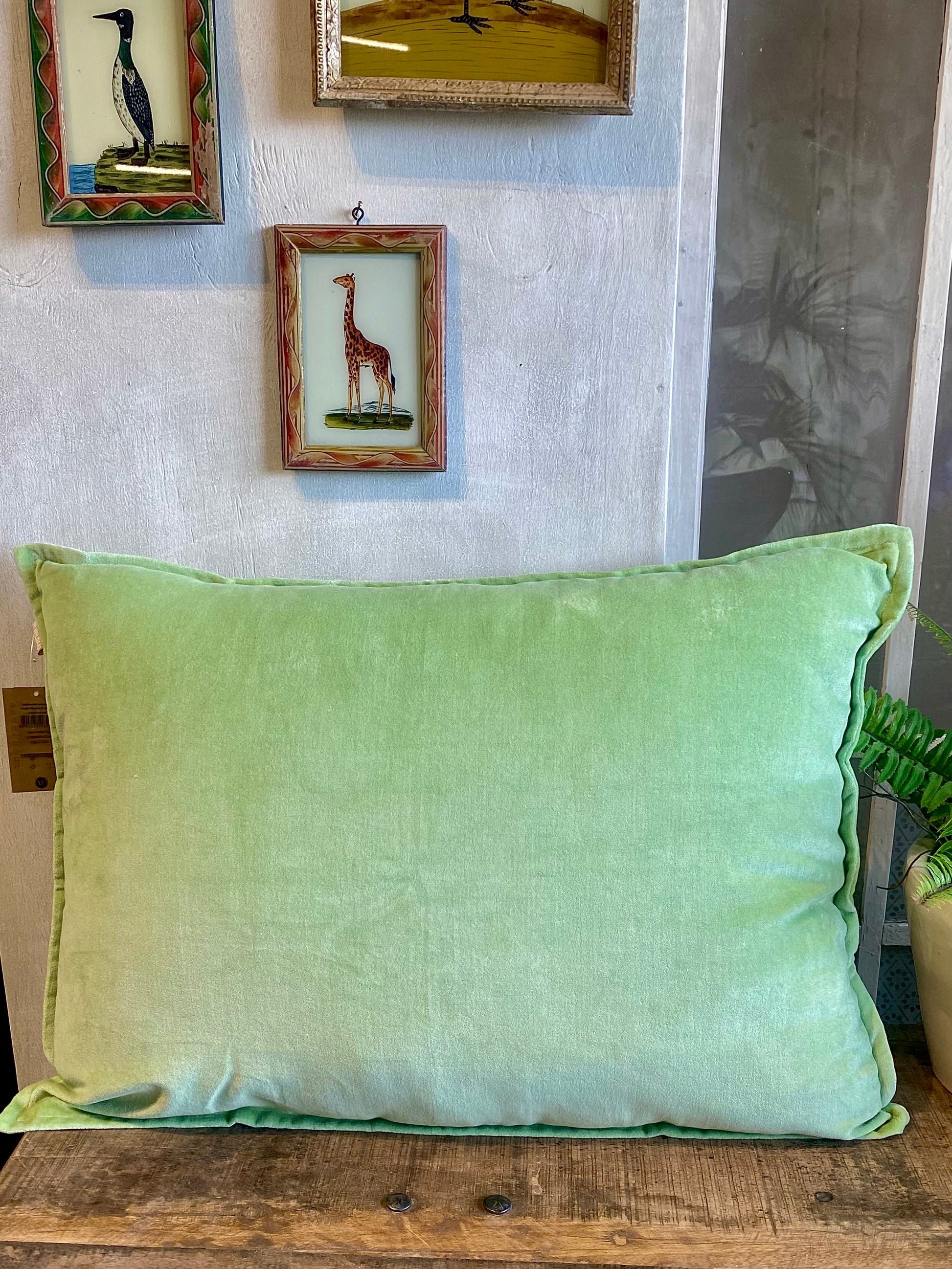 These cotton velvet cushion covers in a soothing seedling green measure 50x70 cm, offering a soft and durable texture that enhances comfort and style. Their solid dyed finish ensures a rich, consistent color that complements any interior, making them a supportive choice for adding warmth and elegance to your living space.