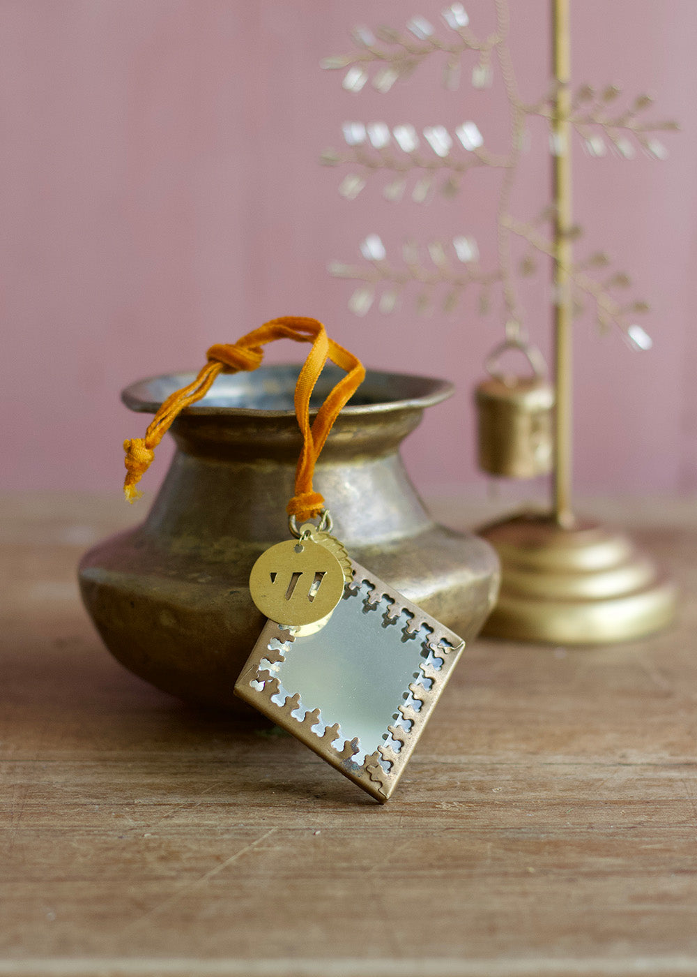 The Diamond Mirror Ornament TI2107 is a handcrafted brass piece that showcases the finesse of Indian metalwork. Its geometric diamond shape paired with a reflective mirror surface creates a modern yet timeless accent. Ideal for boutique collections, wall décor, or festive displays, it brings sophistication, light, and artisanal character to any curated space.