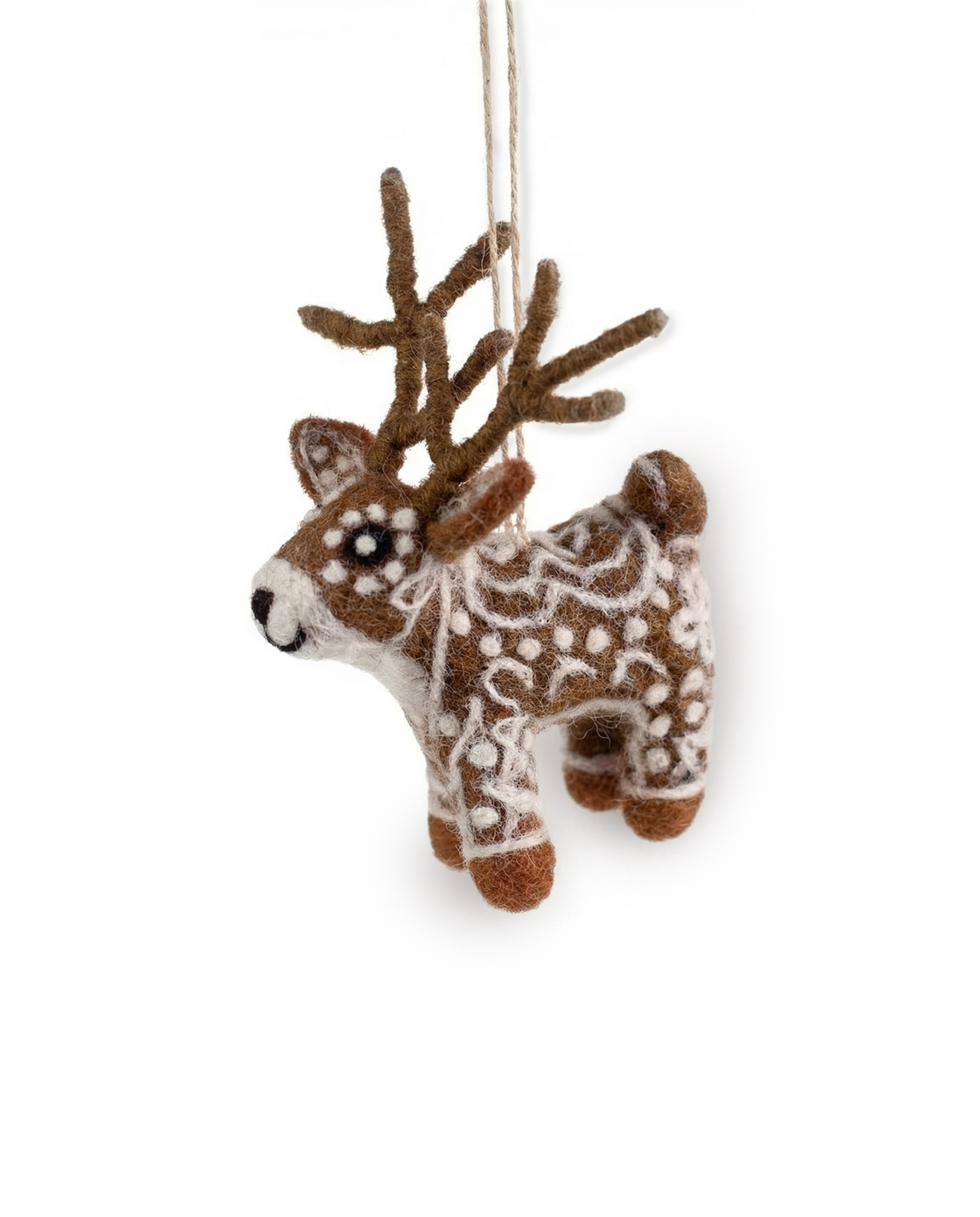 Charmant vilten ornament in de vorm van een bruin hert, handgemaakt met delicate details. Een bosachtig sieraad dat een natuurlijke touch geeft aan kerstbomen en feestelijke decoraties.