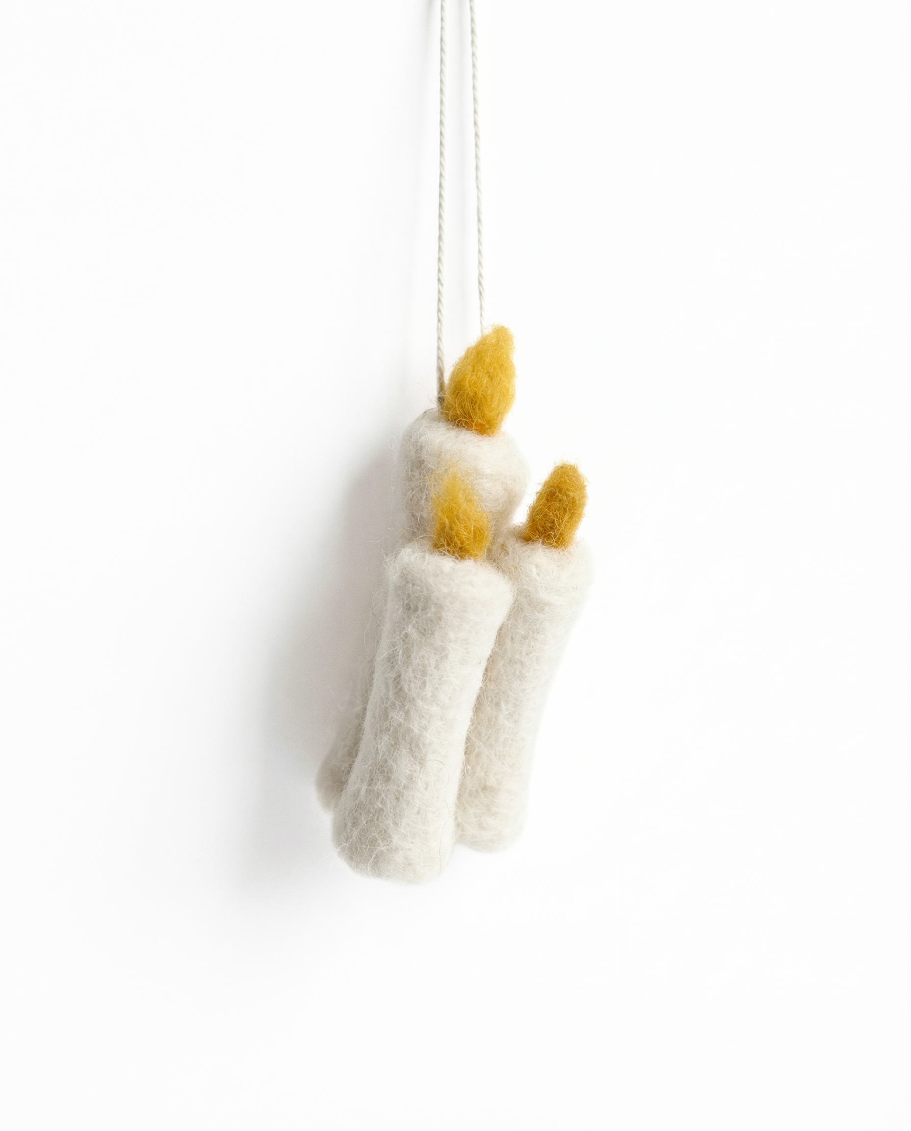 Charmant vilten ornament met een groep kaarsen, symbool voor warmte en saamhorigheid. Met zorg handgemaakt, ideaal als feestelijke boomdecoratie of als seizoensdecoratie.