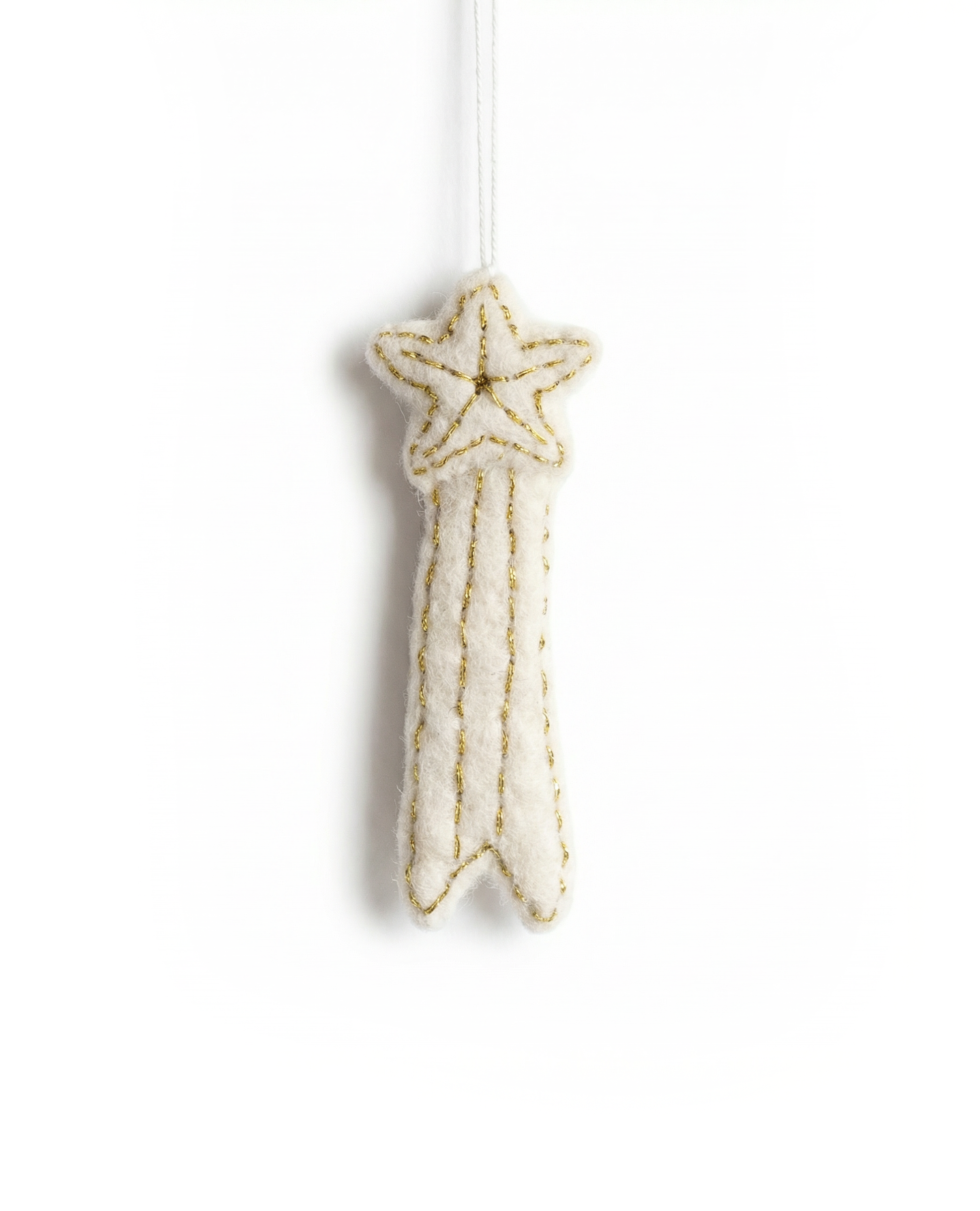 Handgemaakt vilten ornament in de vorm van een vallende ster, afgewerkt met elegante gouden contouren. Een feestelijk accent dat sprankeling en charme toevoegt aan kerstbomen en seizoensdecoraties.