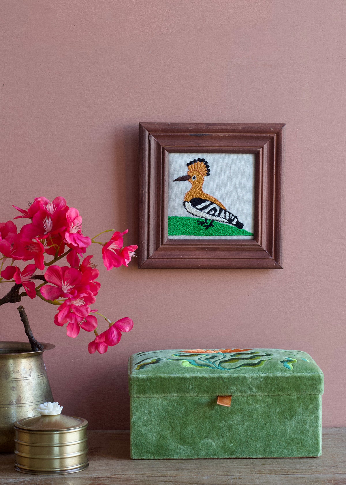Elevate your décor with this Folk Floral Box in luxurious moss green velvet. Featuring intricate embroidery detailing, this piece combines traditional craftsmanship with contemporary style. Perfect for storing treasures, displaying on shelves, or gifting to someone special.