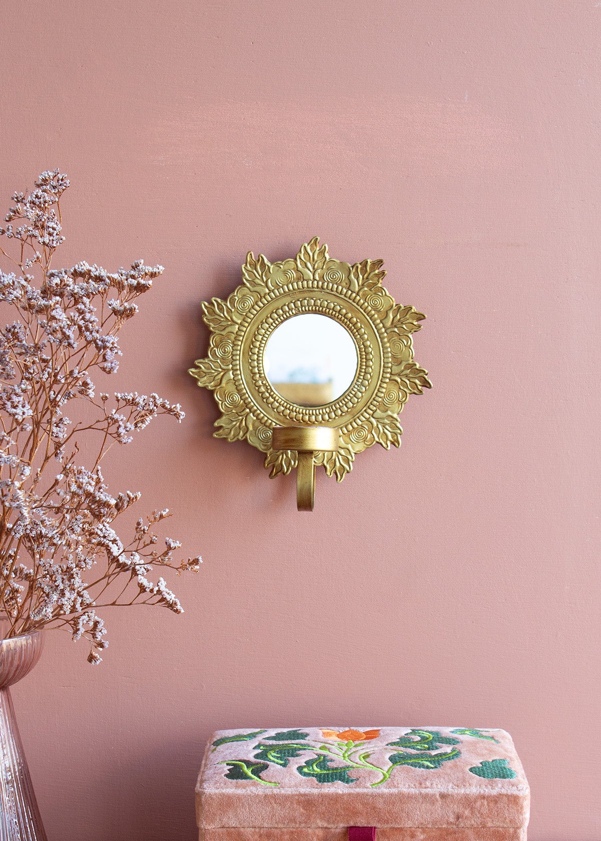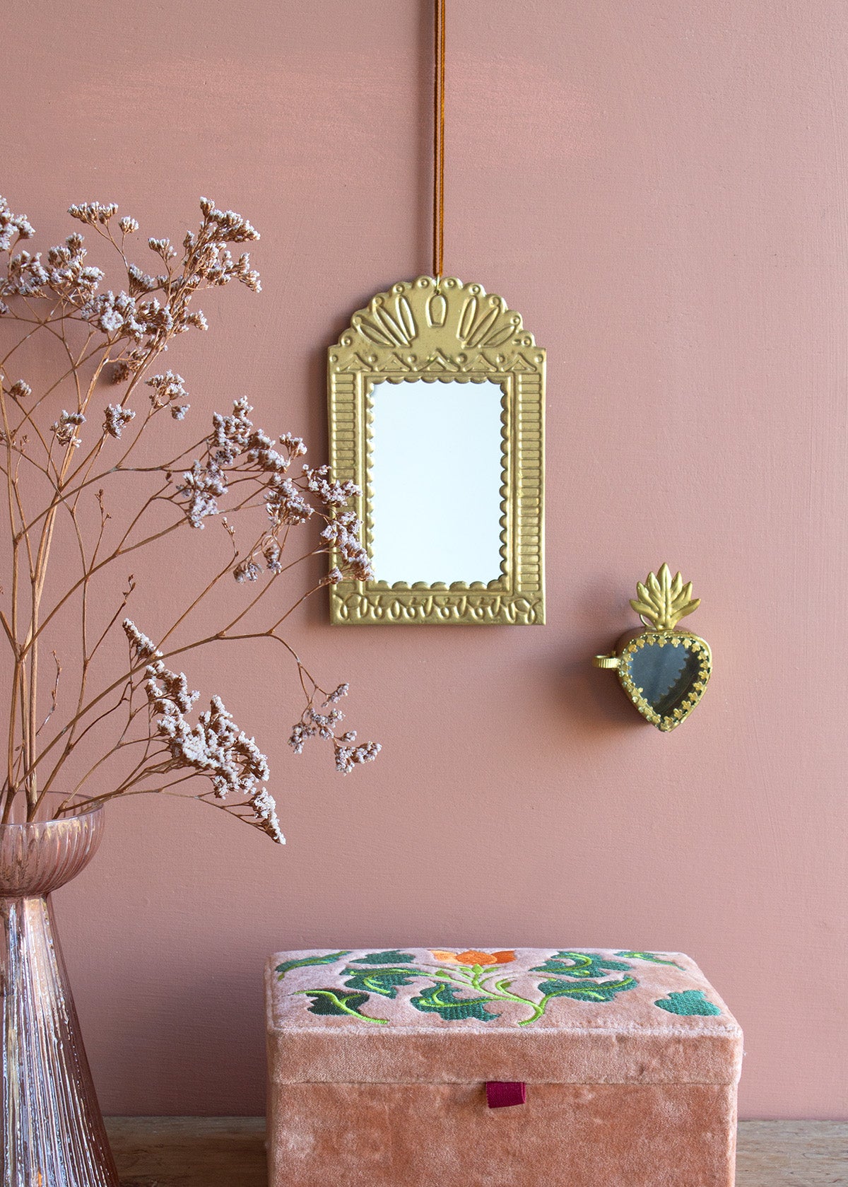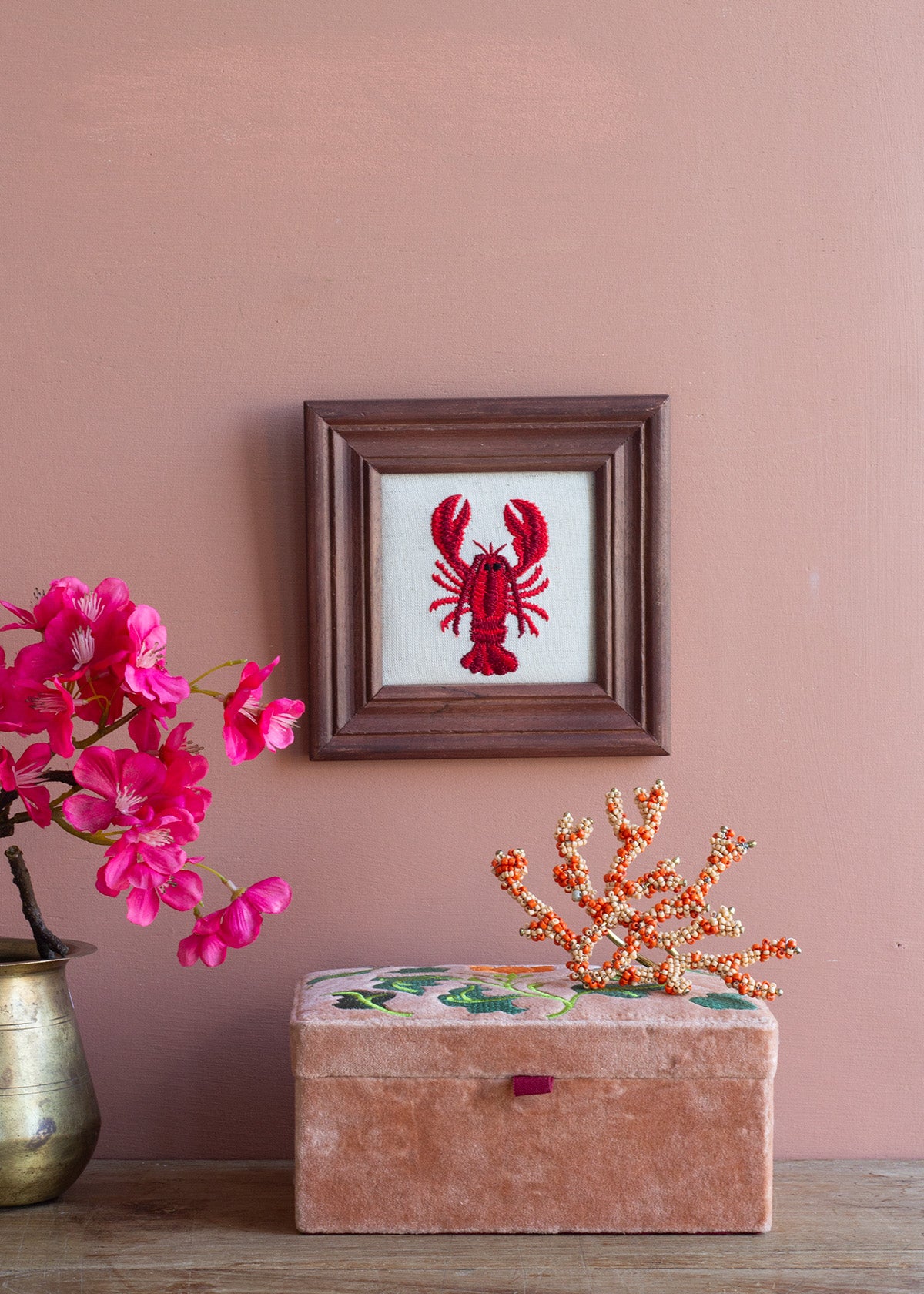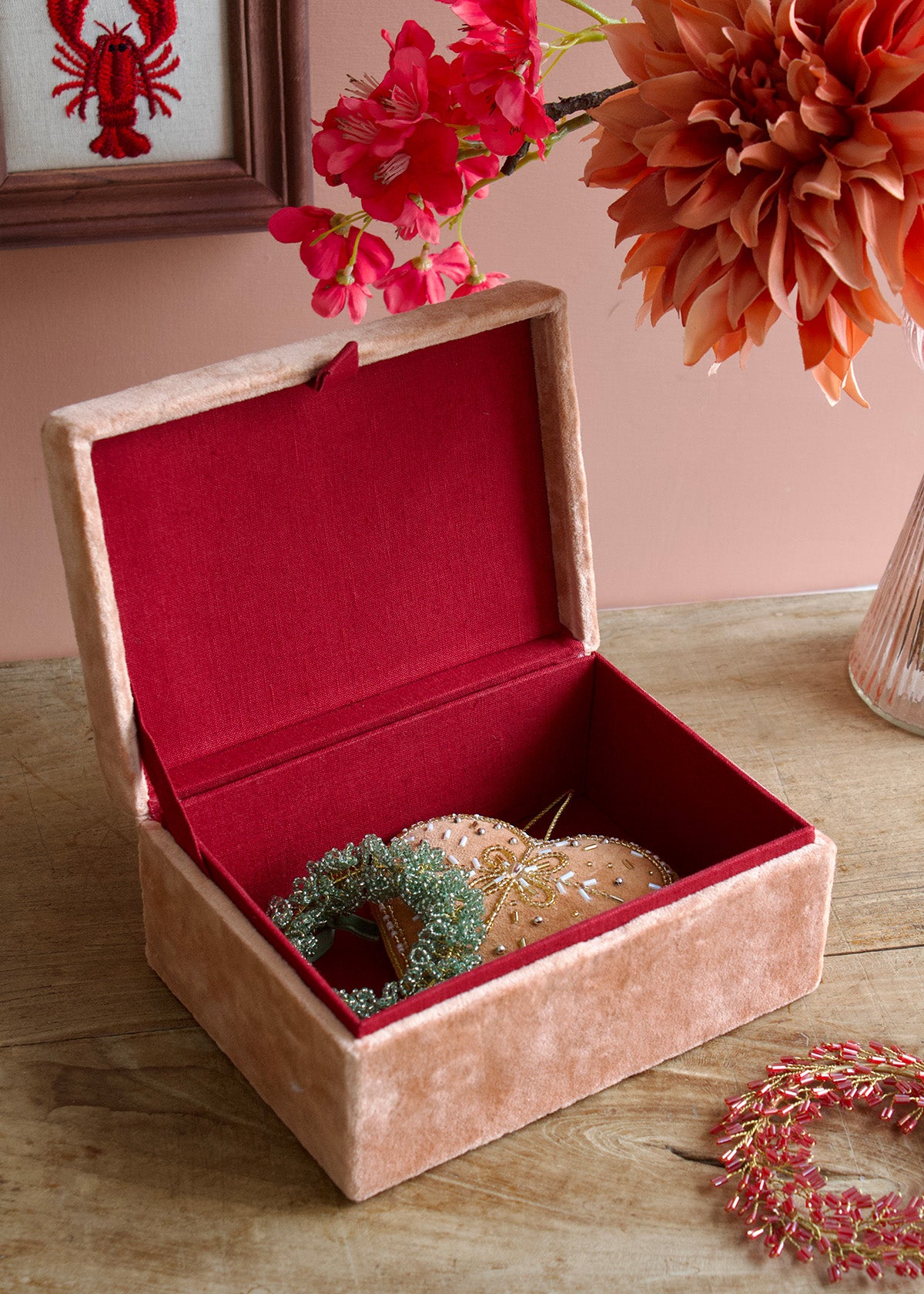Folk Floral Box in luxueus zacht perzikkleurig fluweel, versierd met delicate borduurdetails. Dit elegante decoratieve stuk combineert rijk textielvakmanschap met tijdloze bloemmotieven, perfect om een vleugje verfijning toe te voegen aan elk interieur.