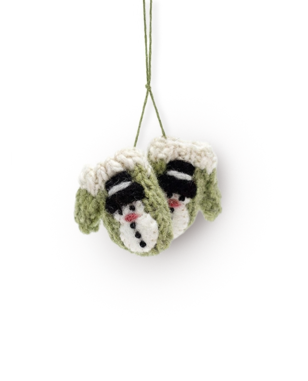 Speels vilten ornament met een sneeuwpop met felgroene wanten. Handgemaakt en lichtgewicht, ideaal voor feestelijke boomversiering en feestdagen.