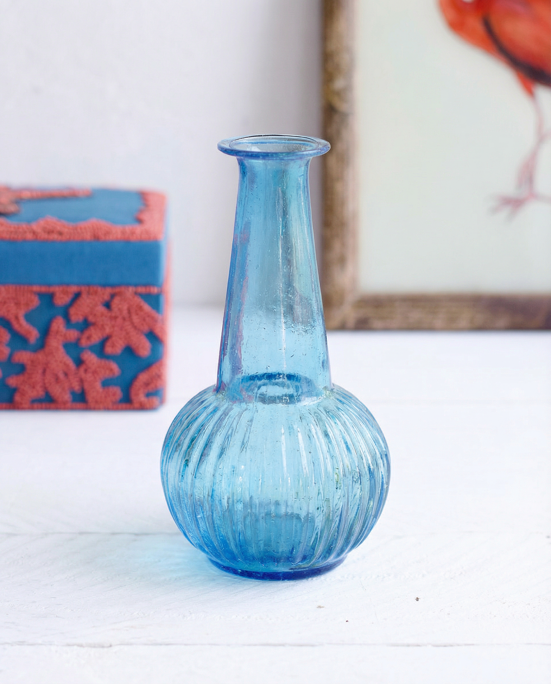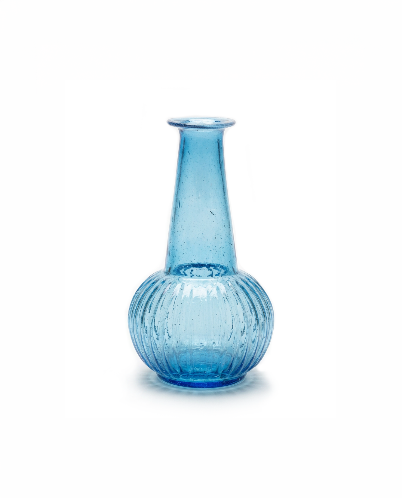 Deze lichtblauwe vaas is vakkundig met de hand gemaakt van gerecycled glas en combineert duurzaamheid met verfijnd vakmanschap. De unieke textuur en kleur zorgen voor een subtiele decoratieve touch, waardoor het een verfijnd accent is voor elk interieur. Ideaal om bloemen te presenteren of om zelfstandig te staan als een milieubewust designstatement.