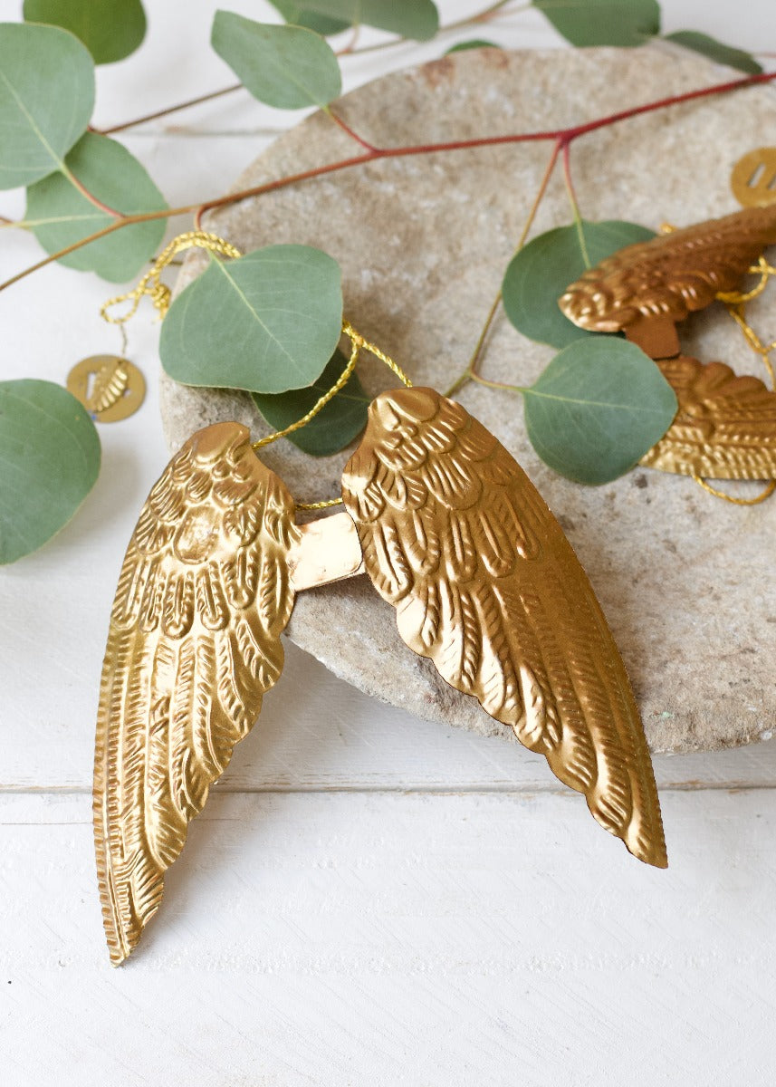 Add timeless elegance with this handmade wing ornament, featuring an antique look in brass-colored metal. Suspended from a gold-coloured cord.