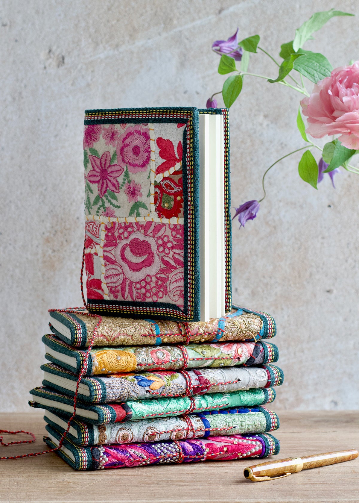 Handmade book from recycled fabric made by the ladies of Sambhali Trust. An NGO that we support. The books are made of recycled fabric and are embroidered.