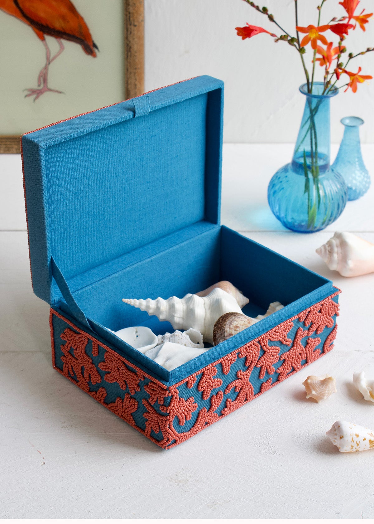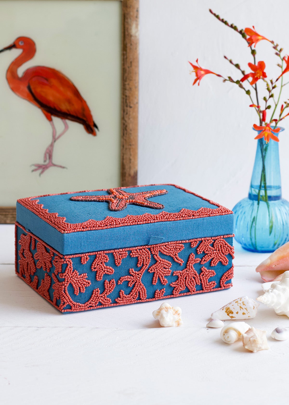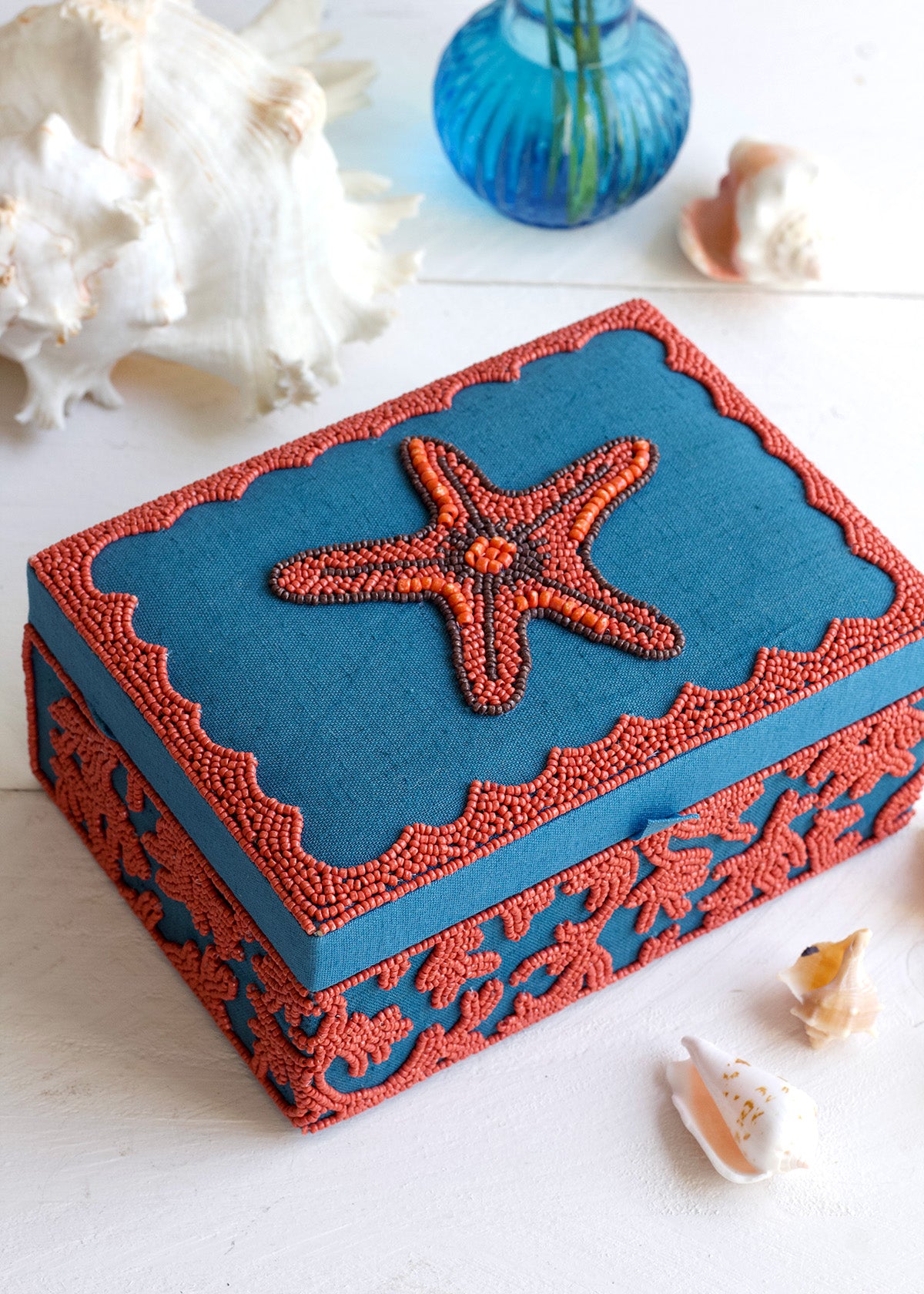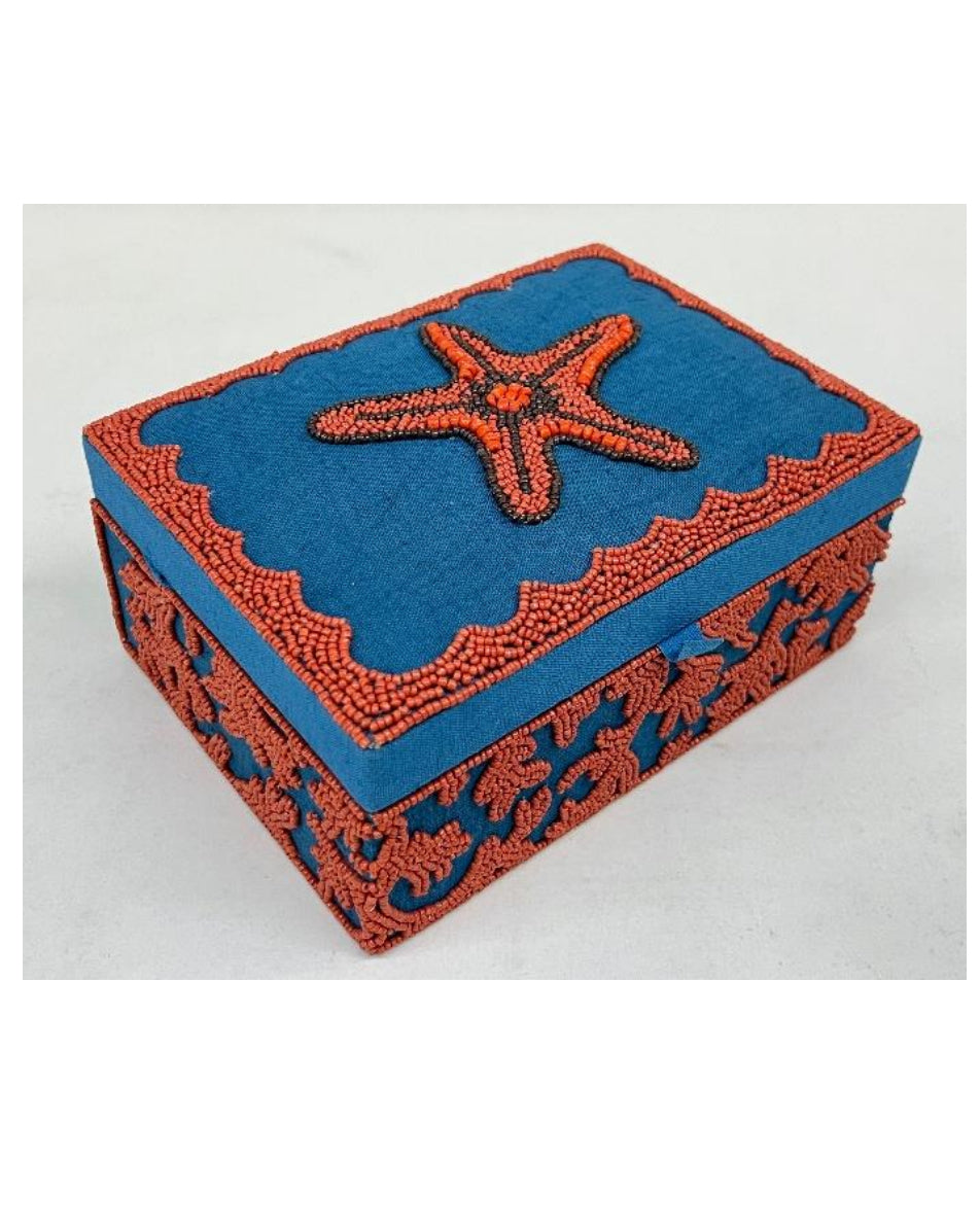 The Beaded Embroidered Box Starfish combines coastal inspiration with skilled craftsmanship. Its delicate beadwork and textured embroidery create a charming accent for display or storage. Ideal for resorts, gift shops, and décor retailers seeking elegant coastal pieces that blend functionality with artistic appeal.