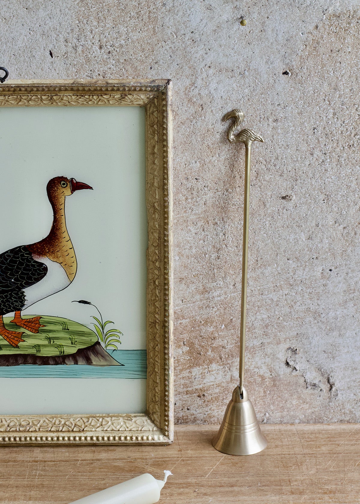 Brass candle snuffer offers a stylish and safe way to extinguish candles without smoke or wax splatter. Crafted from durable brass, its elegant flamingo design adds a charming touch.