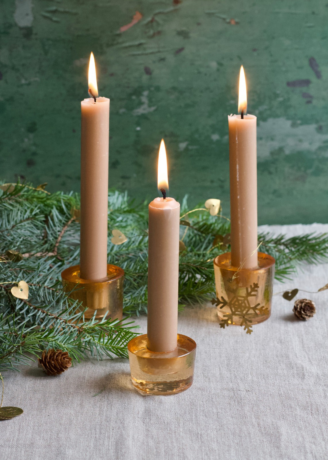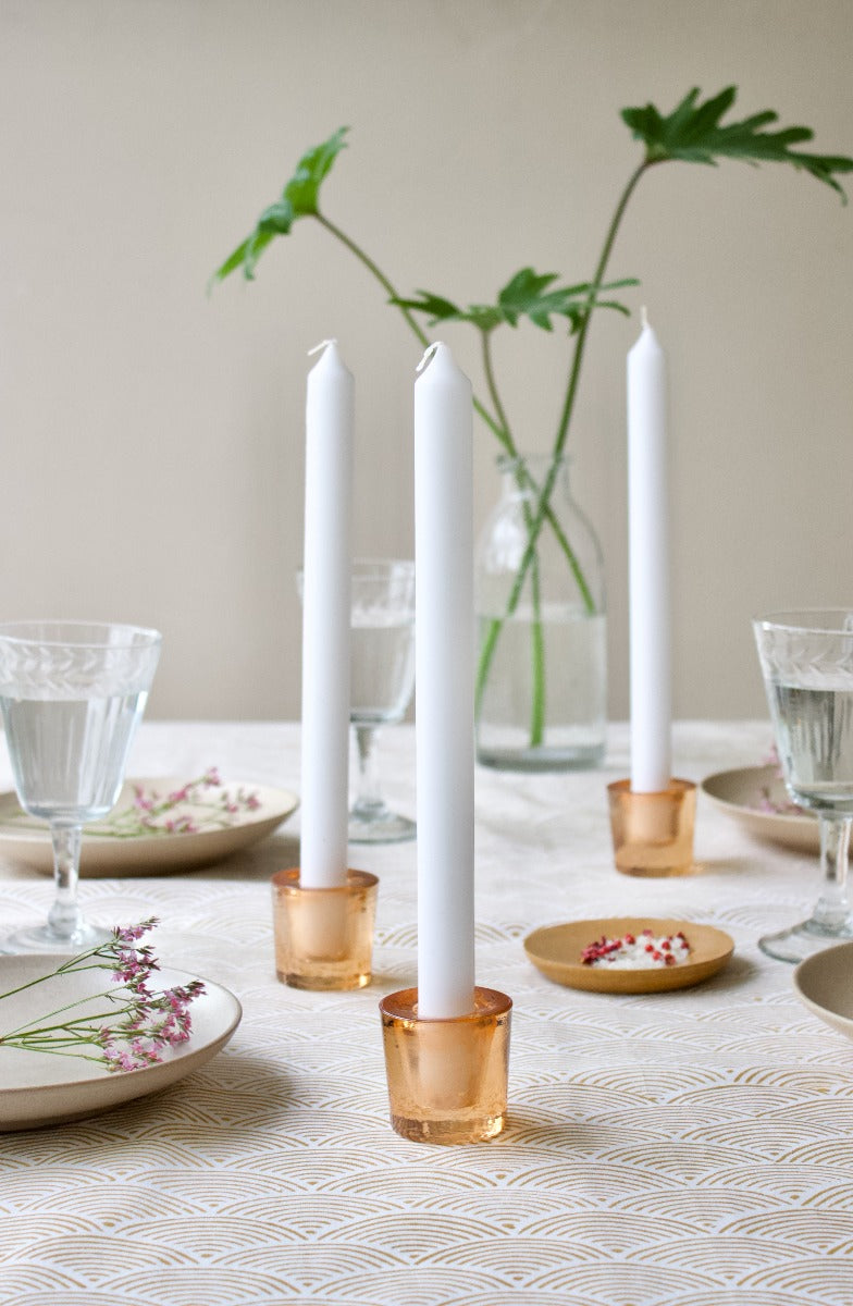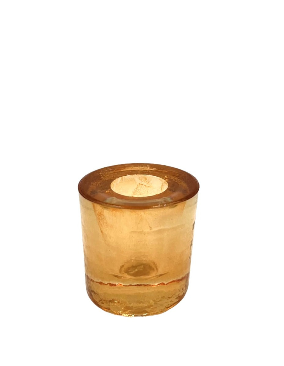 Candleholder glass cinna-peach.This candleholder is handmade from recycled glass. The glass is spray painted in the color cinna-peach. When washing the candle holder you have to avoid washing with hot water as the color may disappear