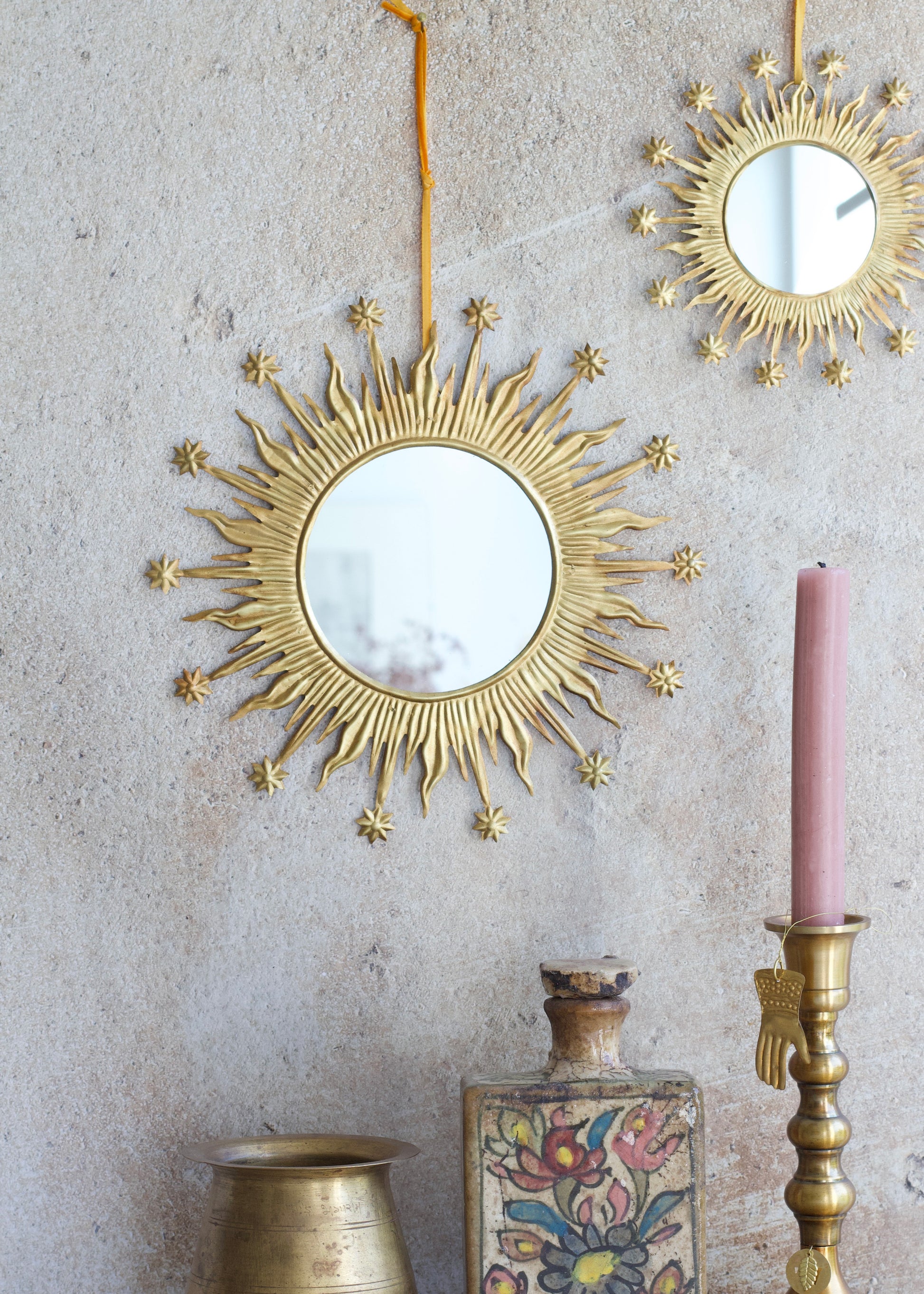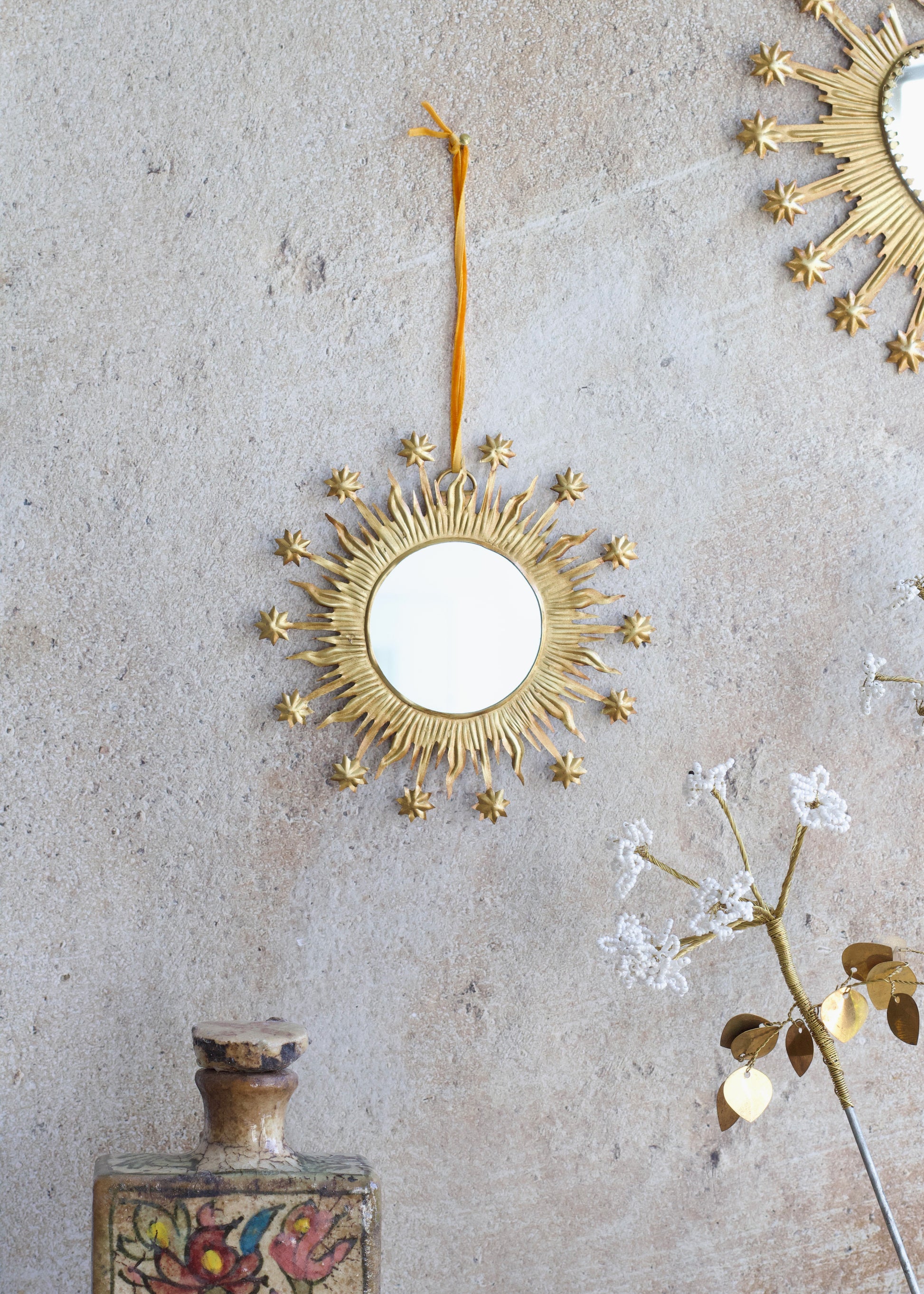 Hand crafted golden mirror from India. Solar shape with beautiful shooting stars surrounding it. Small size, also available in medium and large.