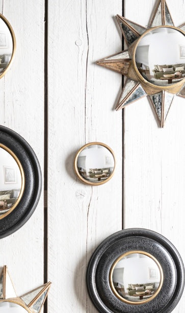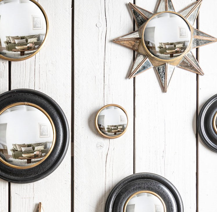 This decorative convex mirror of the Weldaad Collection has a curved reflecting surface.