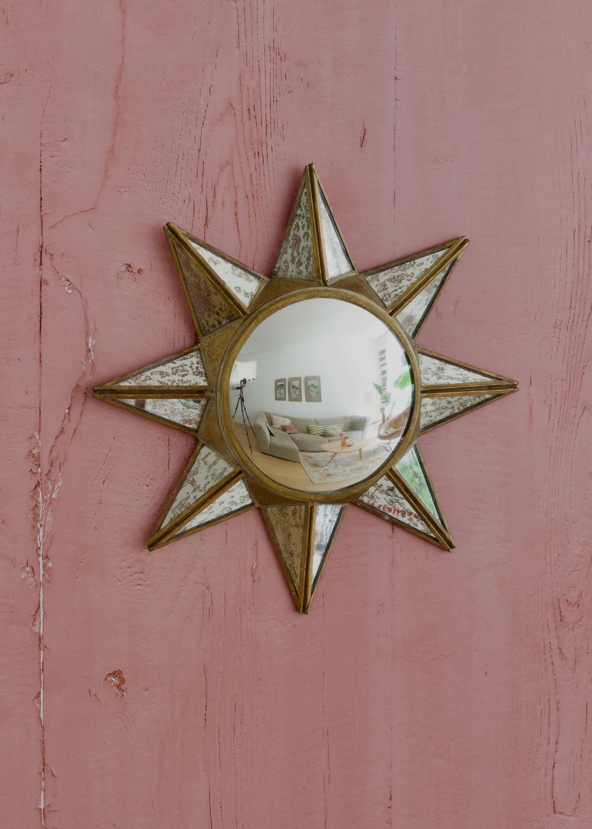 The Convex Star Mirror TI2111 is a handcrafted brass décor piece that blends traditional Indian artistry with modern form. Its star-shaped frame and convex mirror create a captivating play of light and depth. Ideal as a wall accent, it brings character, craftsmanship, and visual intrigue to any space.