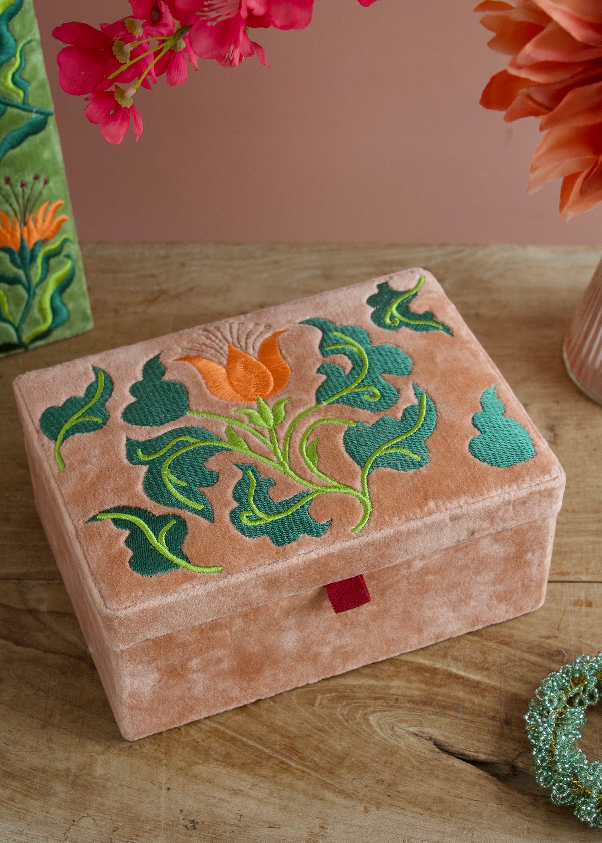 Folk Floral Photo Frame in luxurious soft peach velvet, adorned with delicate embroidered floral details. This elegant frame brings warmth and artistic charm to any room, perfect for displaying cherished memories.