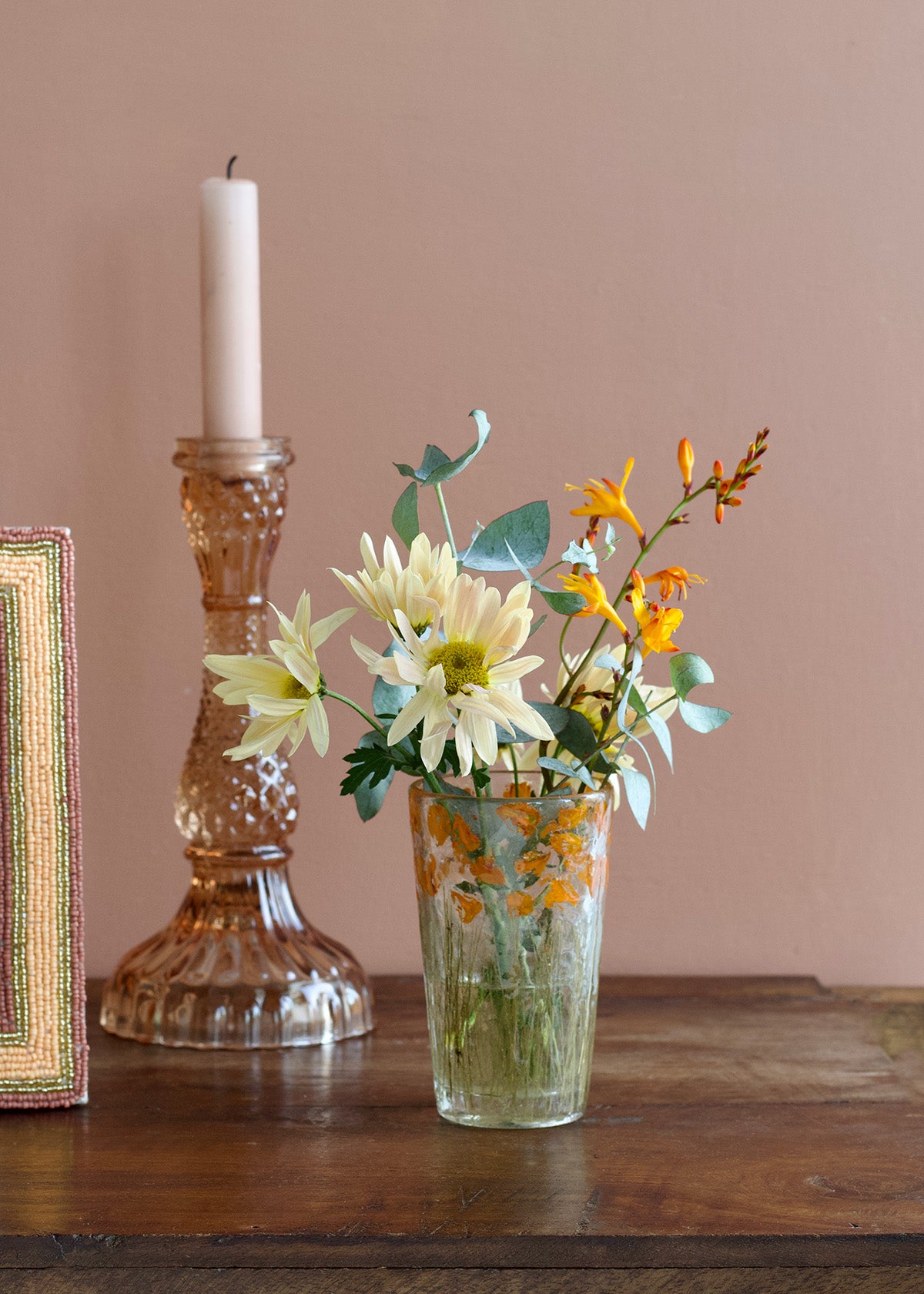 High-top glass with preserved dried flowers and their stem placed all around.