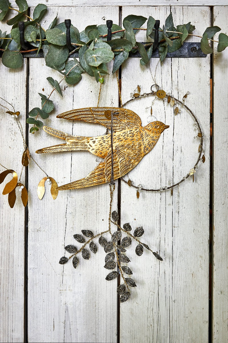 Add a touch of elegance with this handmade branch decoration crafted from brass wire and adorned with glass silver beads as leaves. Finished with a velvet cord and signature W-tag.