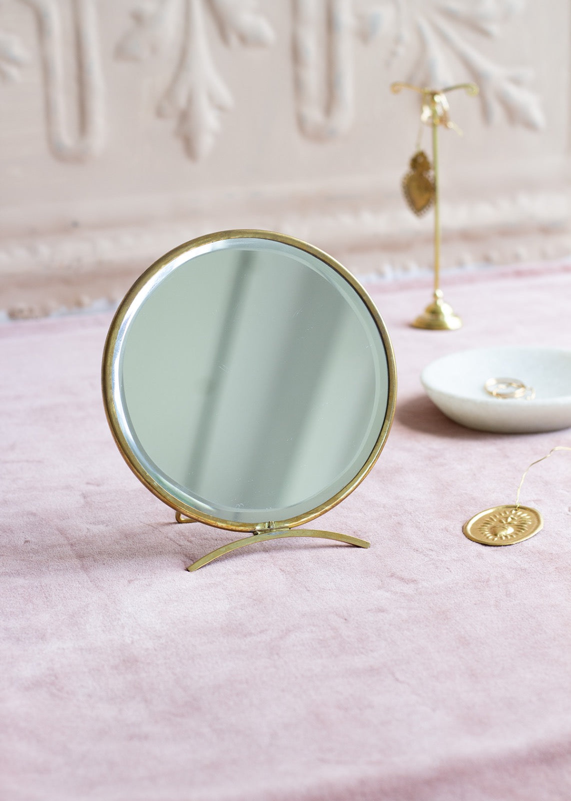Round Mirror stand TI4343, handcrafted design. The beautiful brass frame complements the faceted glass, creating reflection.