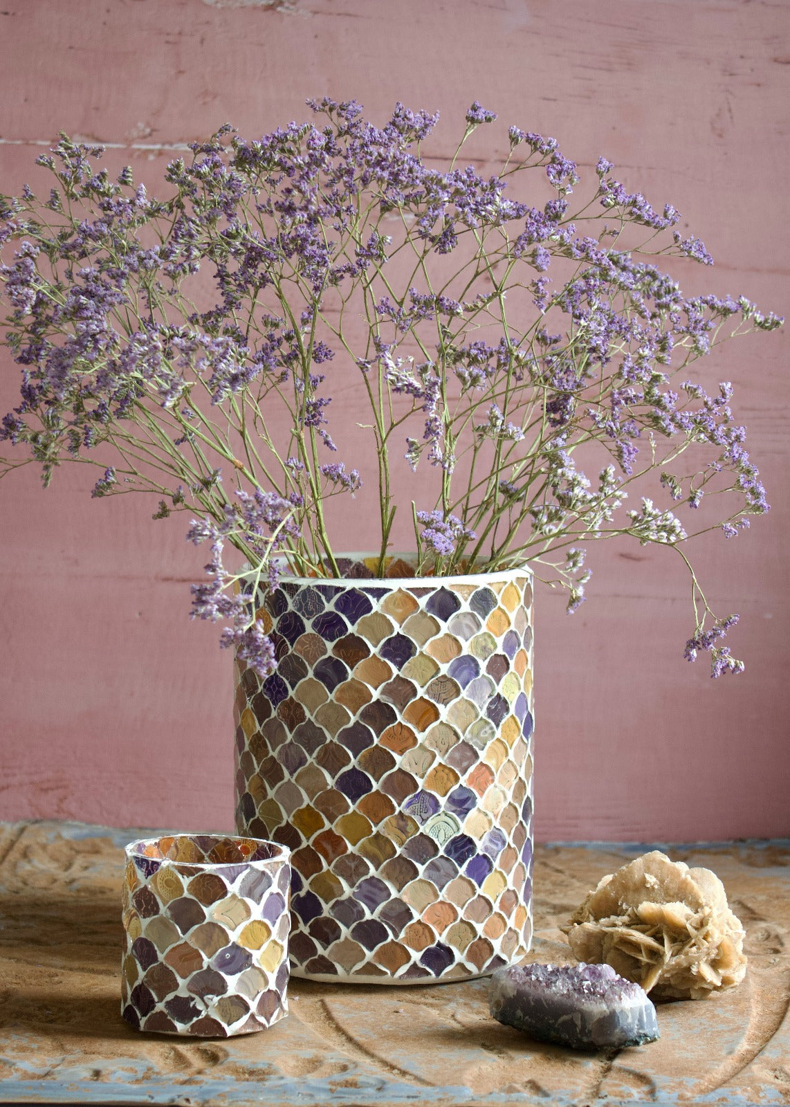 This beautiful handmade tealight holder is crafted from small pieces of recycled glass, creating a unique and shimmering effect. It can also be used as a vase and is available in a smaller size.