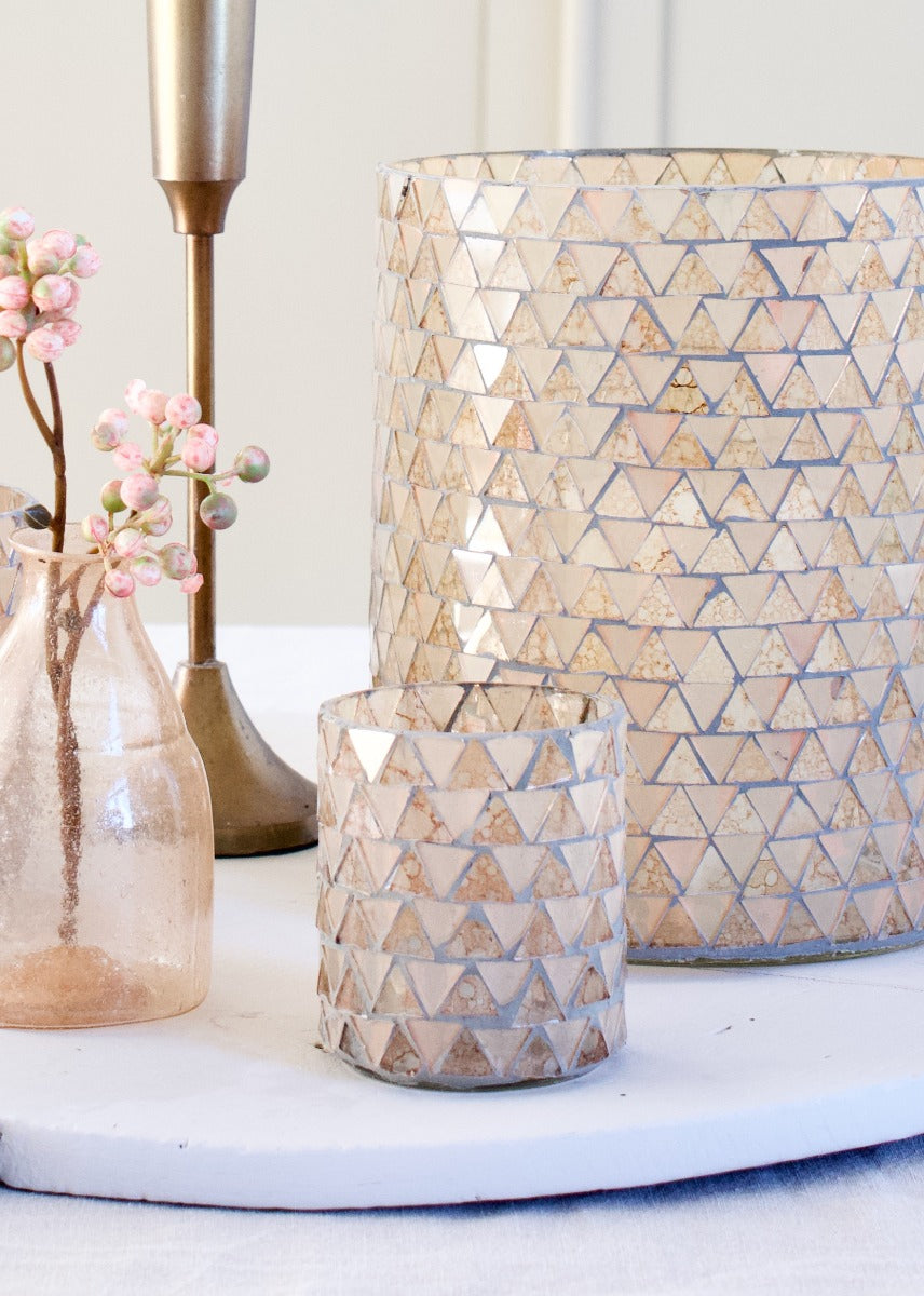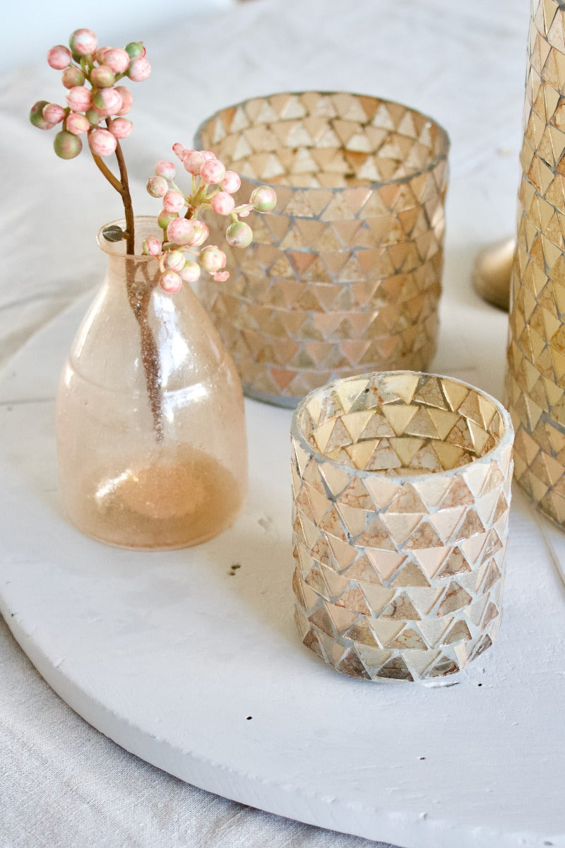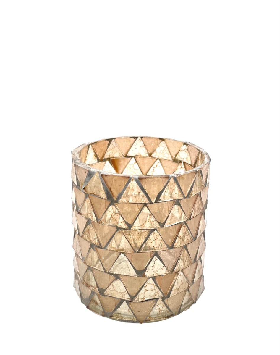 This handmade tealight holder is crafted with a detailed mosaic design, casting a soft and colorful glow. Measures 7 by 7 by 8 centimeters.