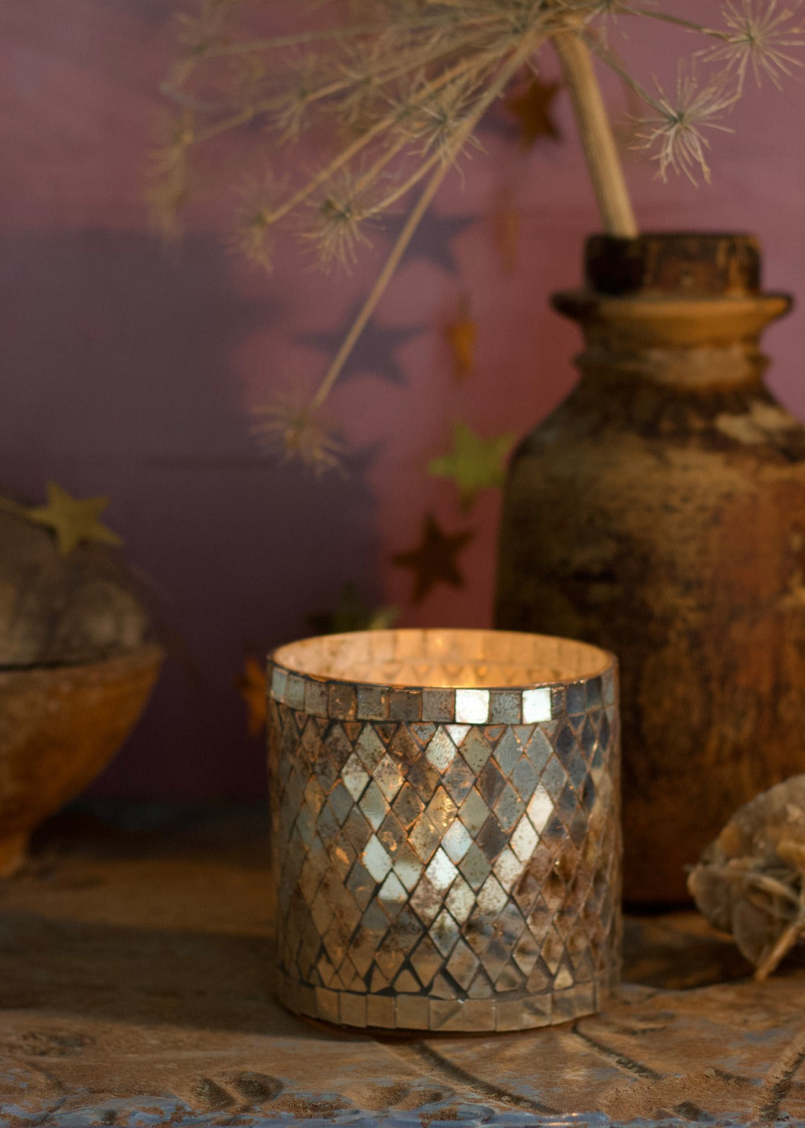 This handmade tealight holder features a striking glass mosaic with an antique look. Versatile in design, it can also be used as a vase. Measures 12 by 12 by 12 centimeters.