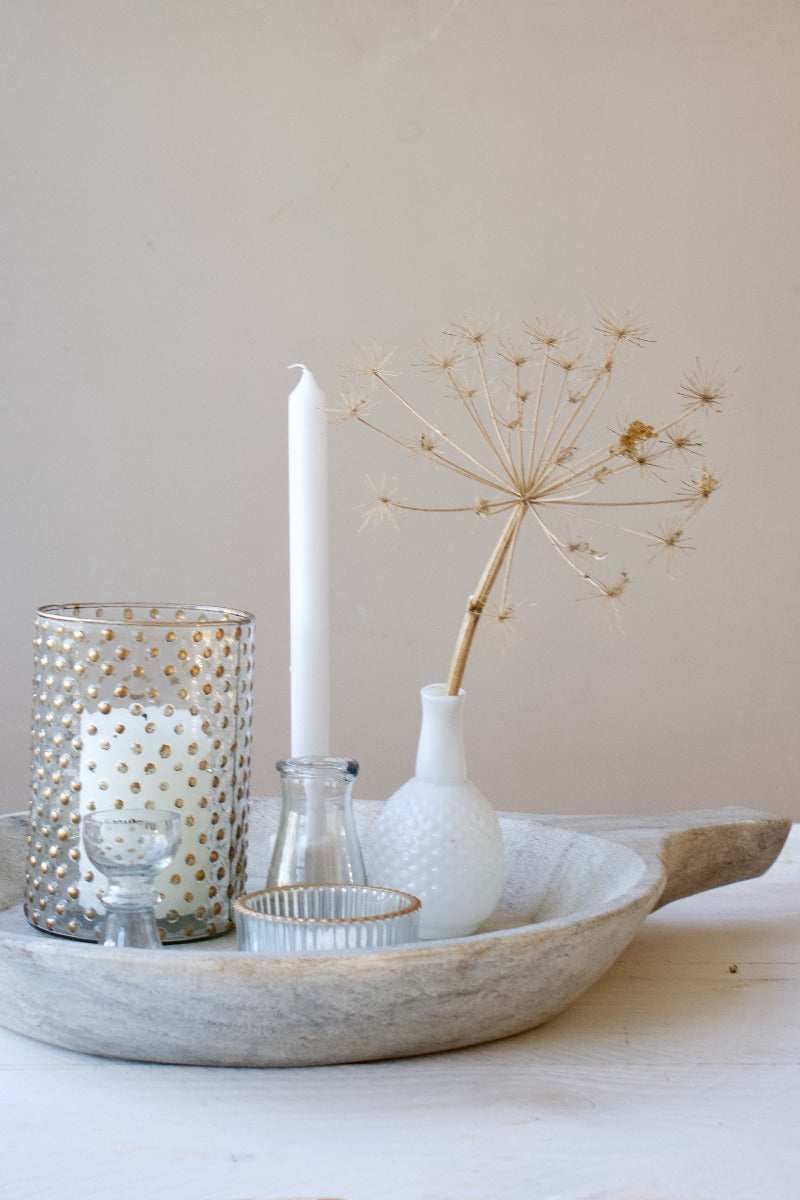 This handmade glass tealight holder features a refined gold coloured rim, adding a subtle touch of elegance to any setting.