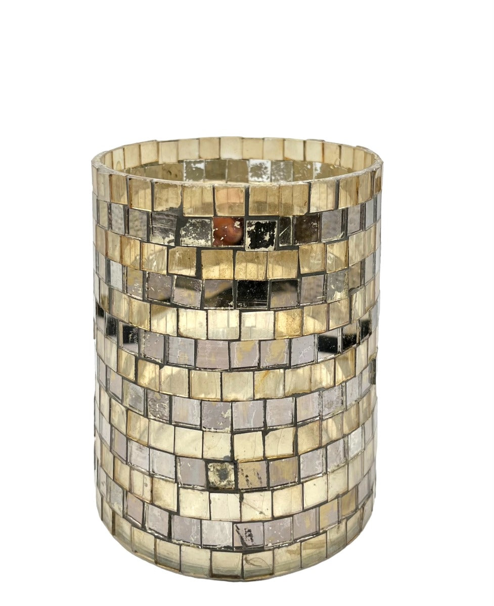 This handmade vase features a colourful mosaic design with delicate beads, adding a cheerful and artistic accent to any room. Measures 10 by 10 by 13 centimeters.