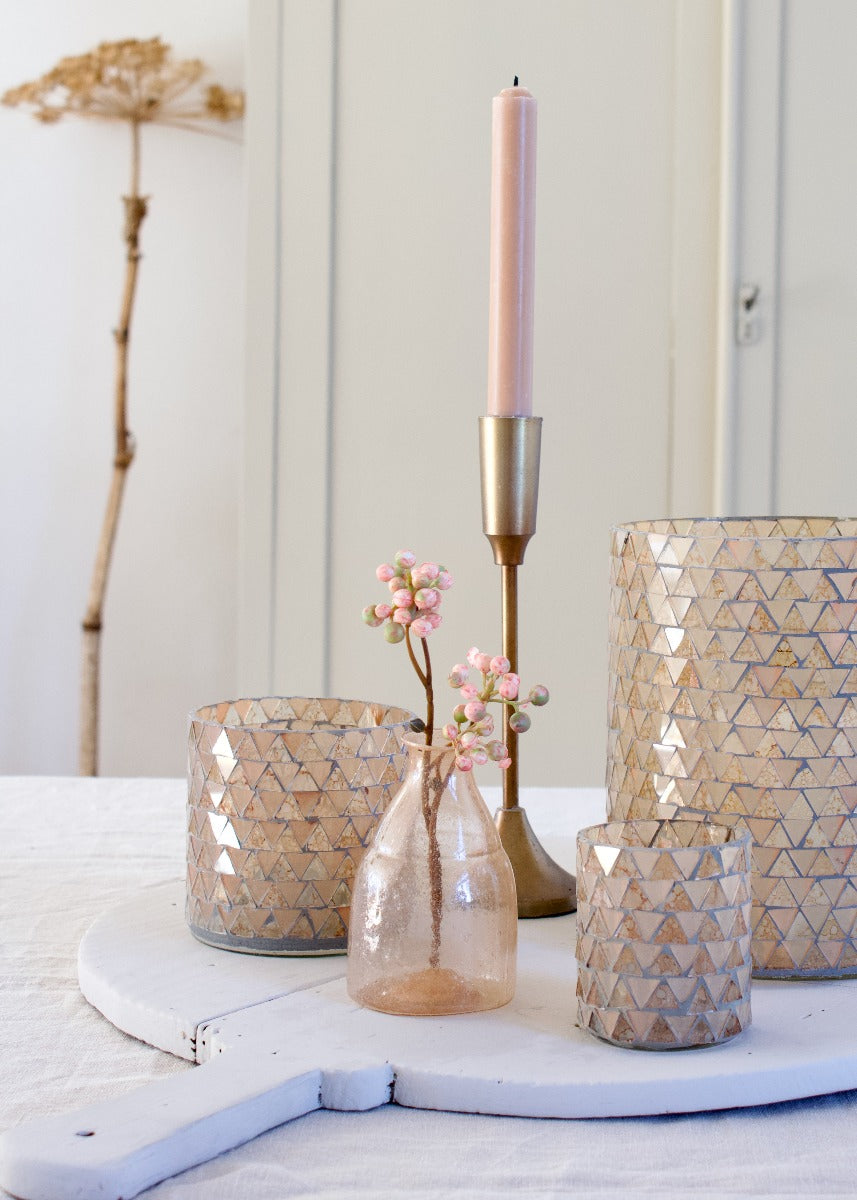 This handmade vase showcases a striking mosaic design, adding texture and character to any interior. Measures 16 by 16 by 21 centimeters.