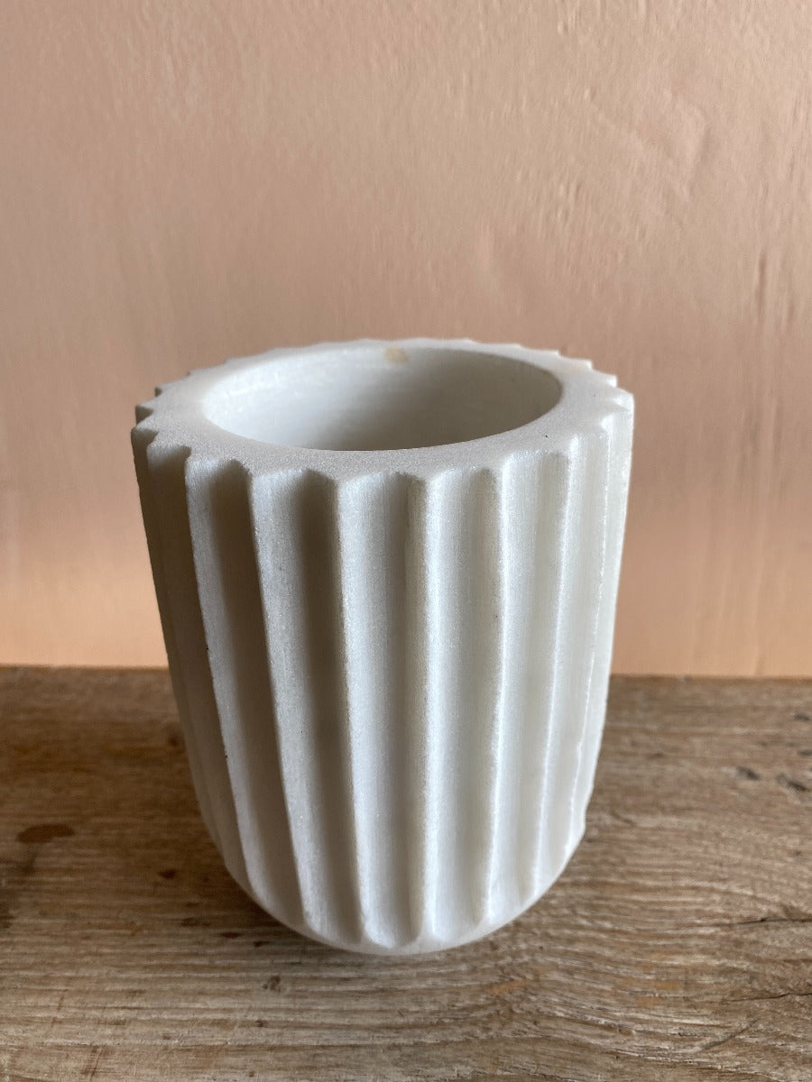 Decorative white marble vase with timeless design.